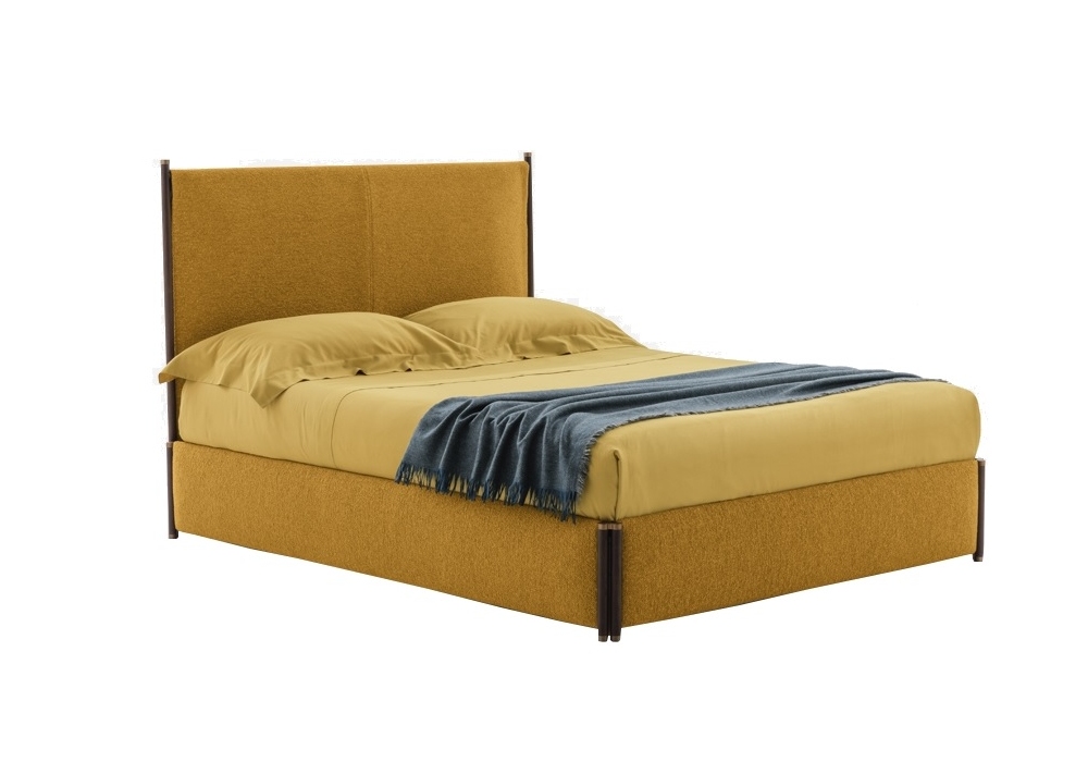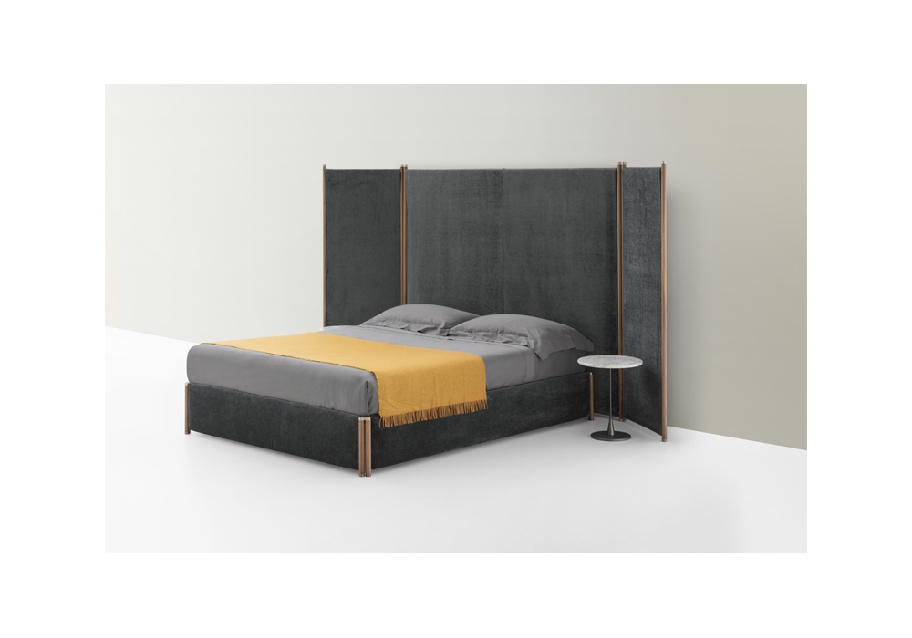 Bricola firmato da Raffaella Mangiarotti per Pianca è un letto con montanti realizzati in legno massello di noce in finitura Canaletto oppure in massello di frassino verniciato Essenza o laccato e puntali decorativi metallici. Struttura in due versioni, sommier o giroletto con pannelli di particelle di legno imbottiti in poliuretano espanso. Rivestimento, sfoderabile, è realizzato in tessuto. Disponibile con rete o con contenitore.