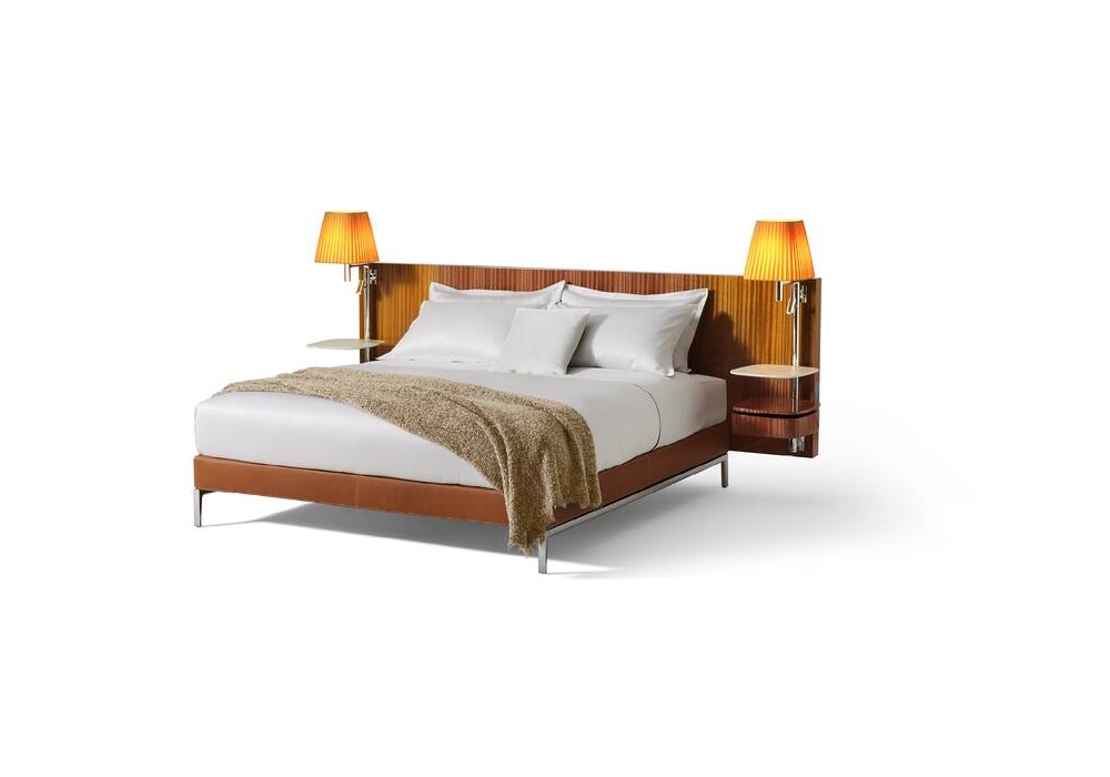 L35 Volage Ex-S Night Wood firmato da Philippe Starck per Cassina è un letto realizzato con testata in un’unica dimensione e in tre pregiate finiture di legno. I due comodini sospesi presentano un piano in marmo e un cassetto in legno nella stessa finitura della testata, dotata di due prese elettriche o USB.