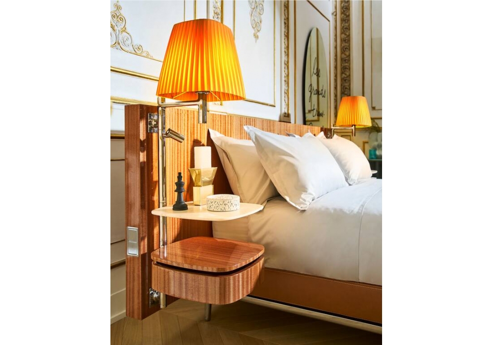 MOGANO WOOD: letto con testata in mogano lucido; giroletto in pelle Voyage Naturale; struttura giroletto e lampade cromate; paralume color Pesca; ripiani in marmo calacatta opaco; comodini in mogano lucido.