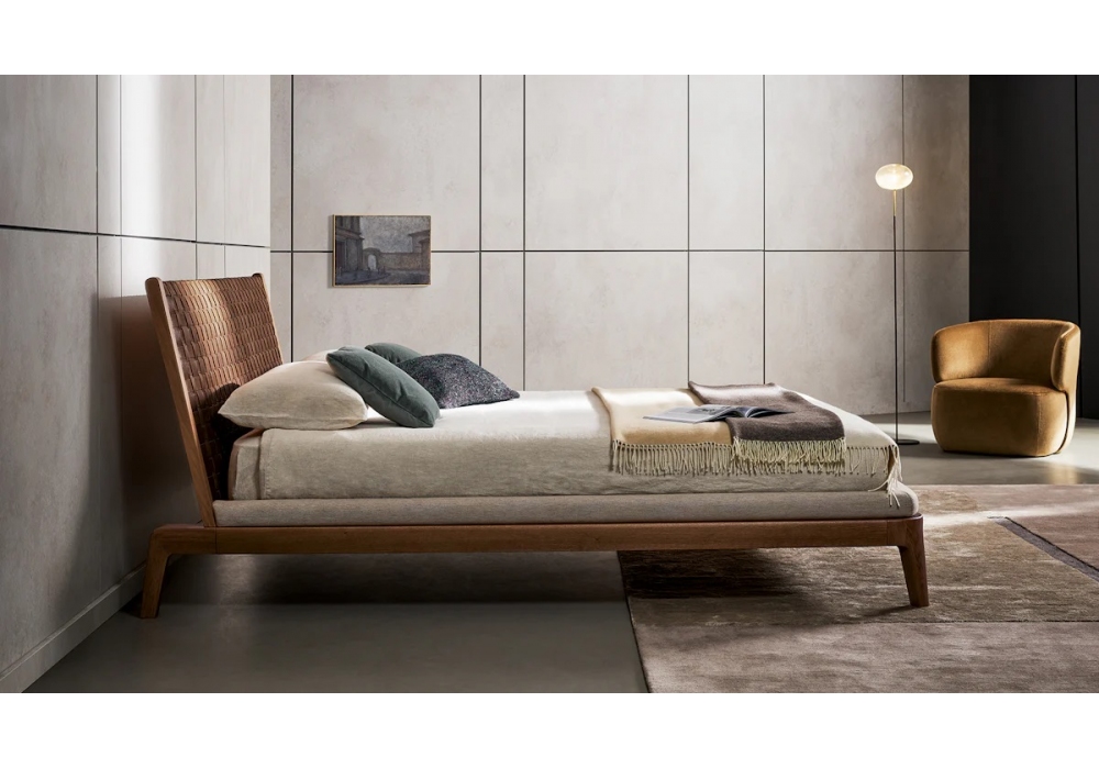 Honeymoon firmato da Mauro Lipparini per Bonaldo è un letto caratterizzato da testiera in legno massello, imbottitura in poliuretano espanso sagomato, giroletto e piedi in legno massello, struttura interna con supporti e piastre in metallo verniciato. Rivestimento della testiera in cuoio pieno fiore intrecciato, giroletto rivestito in tessuto.