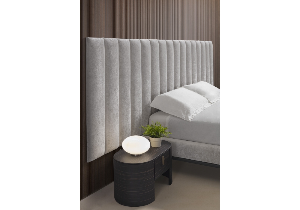 Michelangelo firmato da Joe Garzone per Conte Casa è un letto con struttura testata ancorata al muro in legno multistrato, imbottitura in poliuretano espanso e rivestimento in tessuto o in pelle.