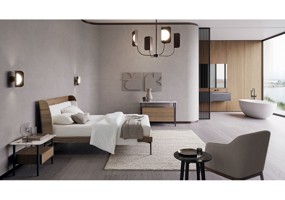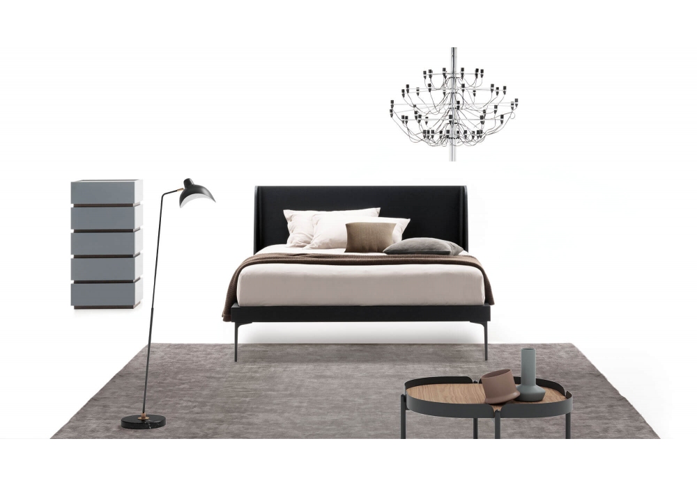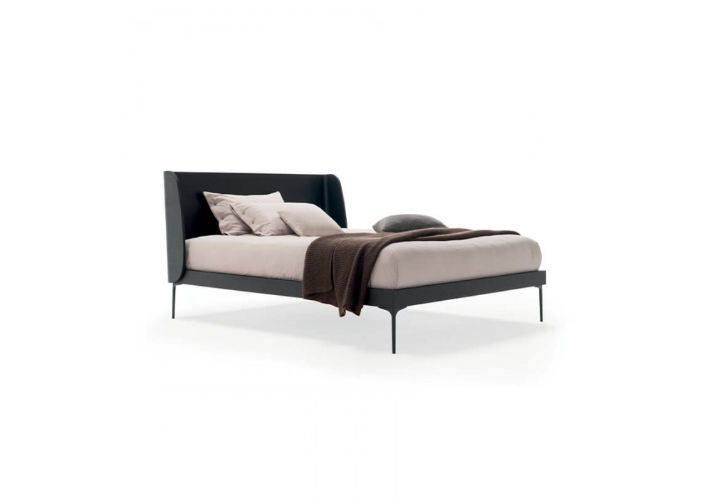 Volume firmato da Dall'Agnese è un letto con testiera curva in multistrato impiallacciato tinto nelle finiture essenza, opzionalmente completata da un cuscino rivestito in tessuto, ecopelle o pelle. Giroletto in legno di media densità, disponibile anche in versione con contenitore. Piedini conici in metallo verniciato.