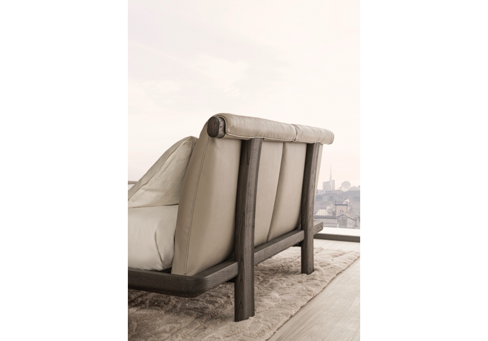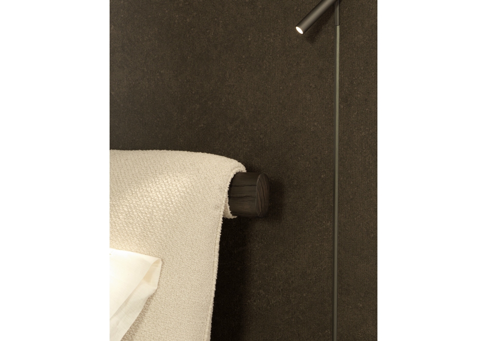 Tibeau firmato da GamFratesi per Molteni&C è un letto con testiera doppia sagomata nella forma caratteristica a “T”. Struttura in rovere caffè e cuscini della testiera rivestiti in tessuto o pelle. Le linee strutturali e il design delle gambe evocano elementi storici e tribali, stabilendo un legame profondo con il passato.