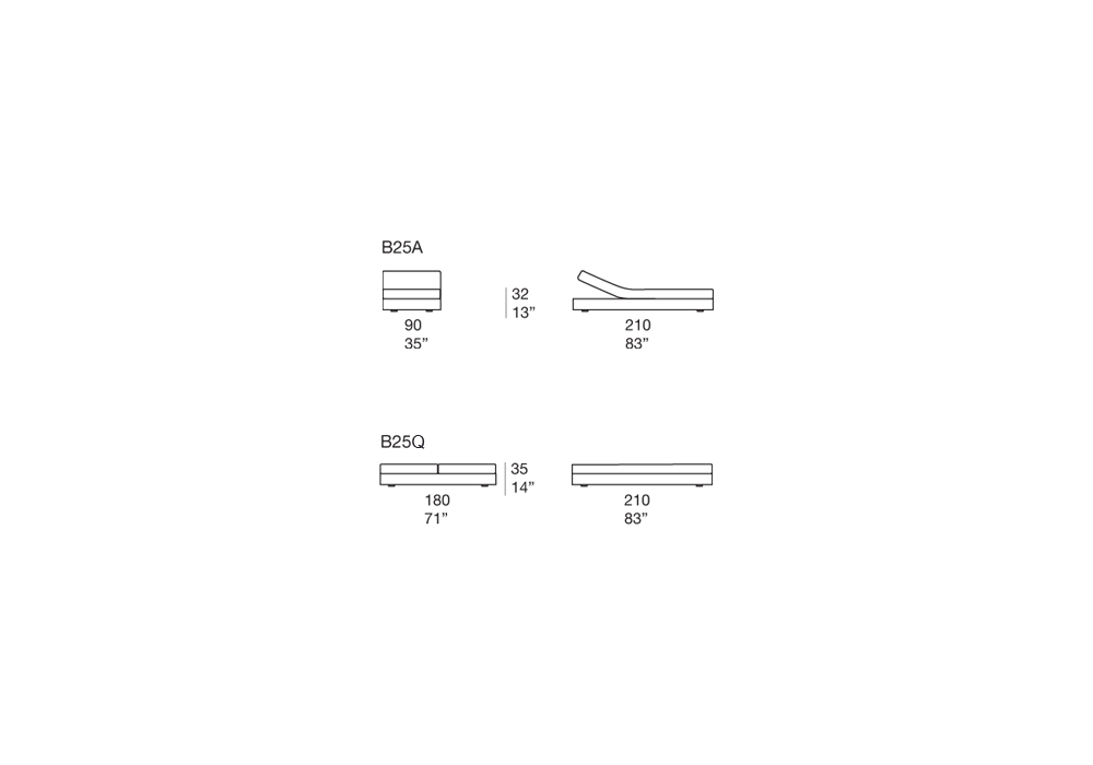 | Dimensioni | 210 x 90 x H 32 cm (B25A); 210 x 180 x H 35 cm (B25Q). |