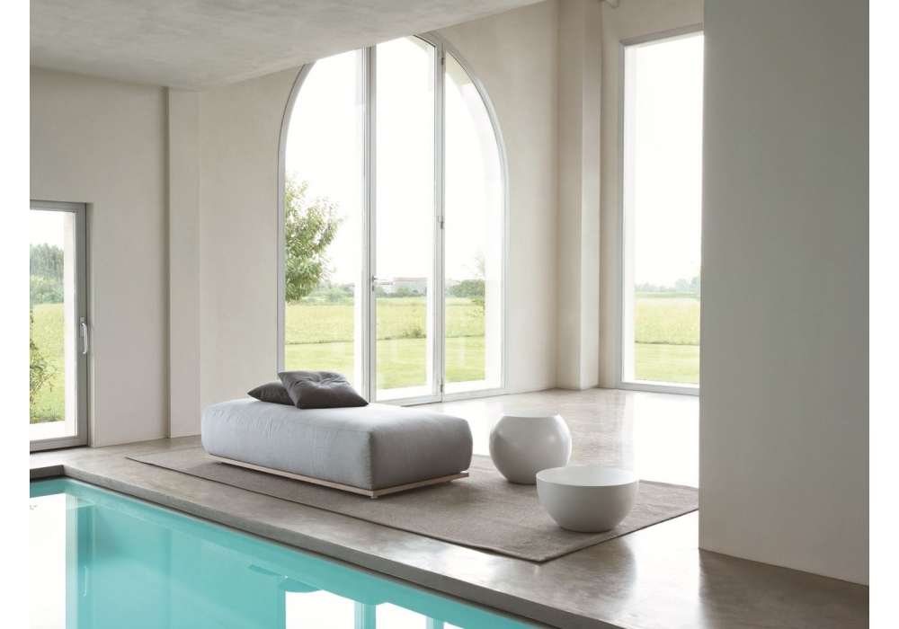 Claud Open Air firmato da Andrea Parisio per Meridiani è un lettino relax per outdoor. Struttura in legno di iroko sbiancato e cuscini in poliuretano e fibra poliestere. Disponibile con topper e poggiatesta in fiberball.