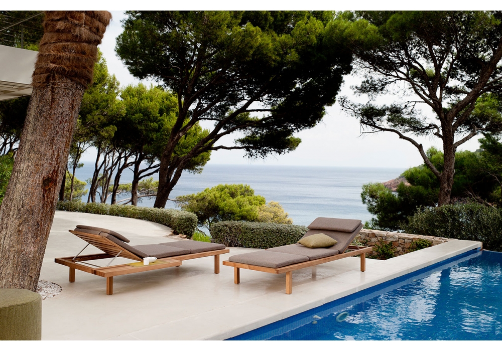 Vis à Vis progettato da Piergiorgio Cazzaniga per Tribù, è un lettino in teak con tavolo integrato. Il materasso è disponibile in tessuto da esterno ed è disponibile in versione a quattro piedi o due piedi e due ruote.