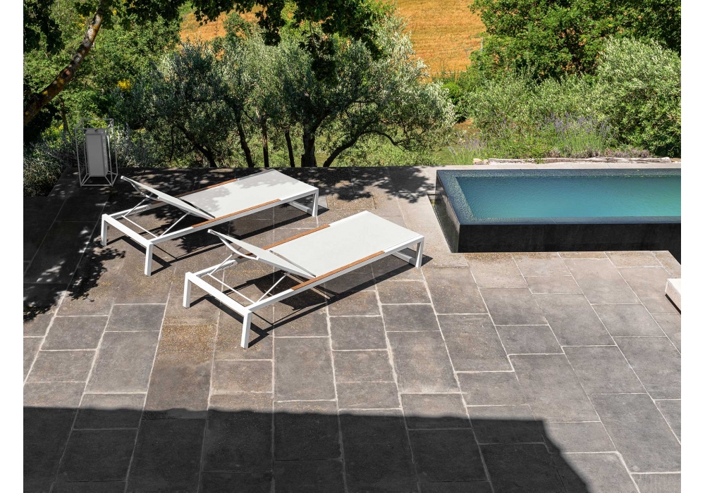 Alabama Alu disegnato da Marco Acerbis per Talenti è un lettino della collezione che prende lo stesso nome, struttura in alluminio verniciato a polvere e seduta in textilene, particolari in teak.