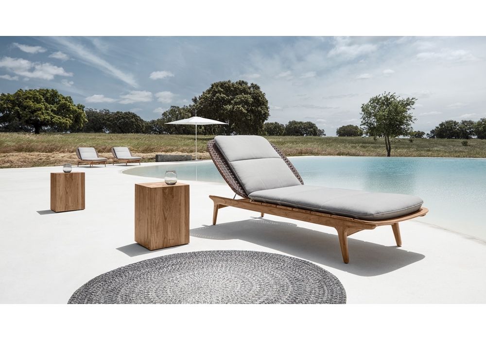 Kay firmato da Henrik Pedersen per Gloster è un lettino con struttura in teak e schienale in vimini intrecciato. Cuscino seduta/schienale in tessuto outdoor incluso. Schienale reclinabile in 5 posizioni, include ruote.