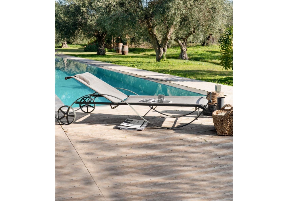 Aurora prodotto e firmato da Unopiù è un lettino con struttura in ferro zincato verniciato color grafite. Il rivestimento è in tessuto tecnico realizzato in materiale plastico.
