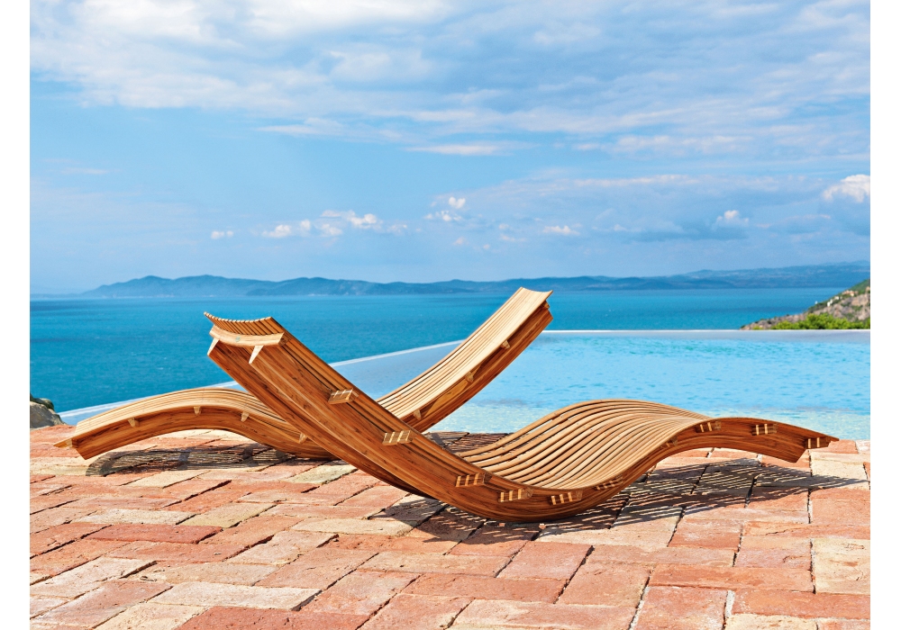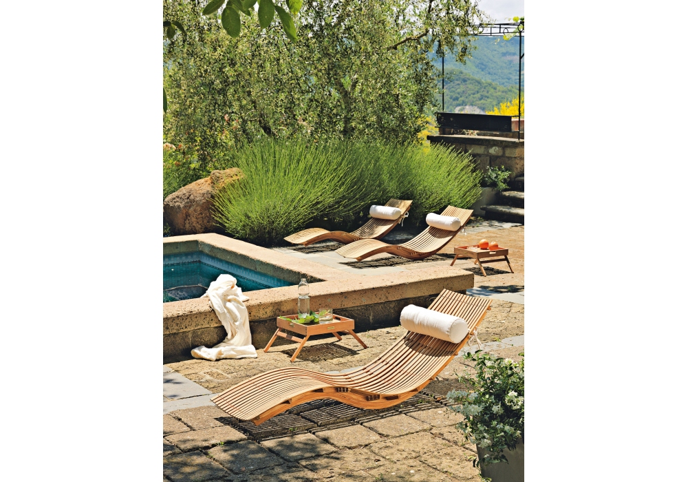 Swing prodotta e firmata da Unopiù è una chaise longue con struttura in teak naturale e supporto in acciaio inox austenitico. La cuscinatura poggia testa è in tessuto acrilico di colore latte.