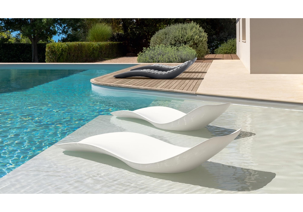 Reef firmato da Marco Acerbis per Talenti è un lettino da sole realizzato in polietilene. Cuscino imbottito in dacron con rivestimento in tessuto per esterni.