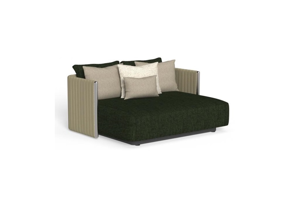 George firmato da Ludovica e Roberto Palomba per Talenti è un daybed da esterno con cinghie imbottite intrecciate su struttura in acciaio e cuscini rivestiti in tessuto.