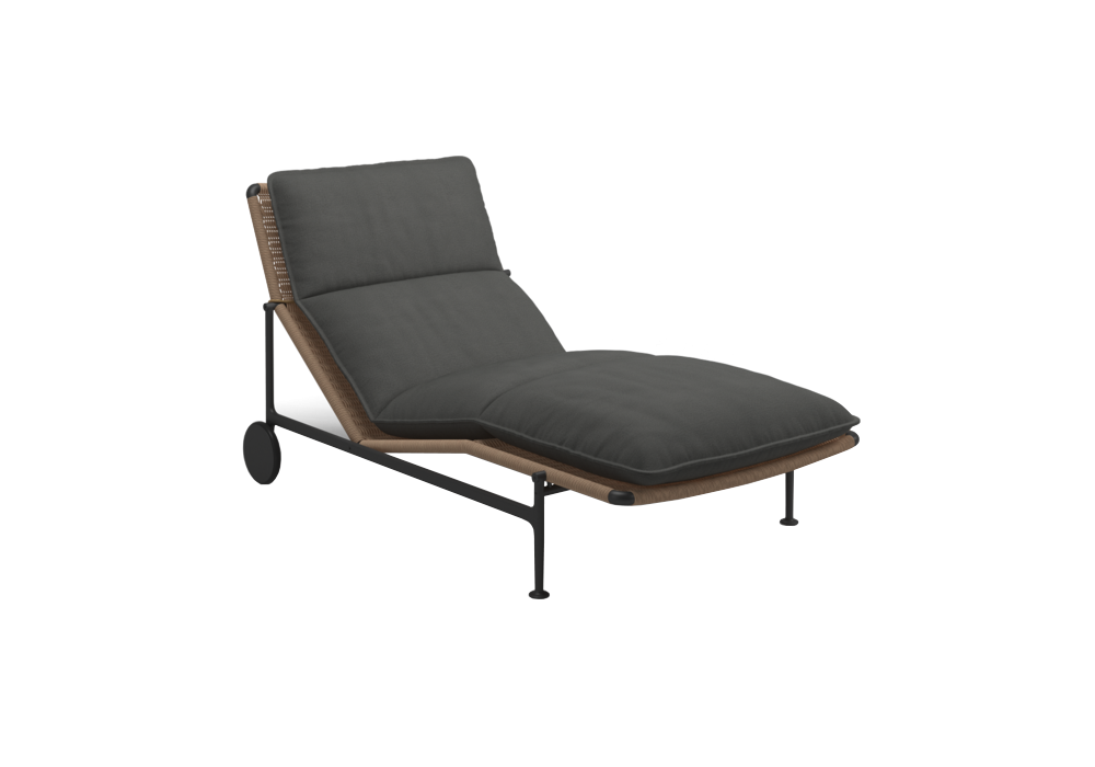 Zenith firmato da Henrik Pedersen per Gloster è un lettino da esterno con struttura in alluminio verniciato a polvere, sedile e schienale in vimini intrecciati color grano. Seduta e schienale in tessuto per esterni inclusi.