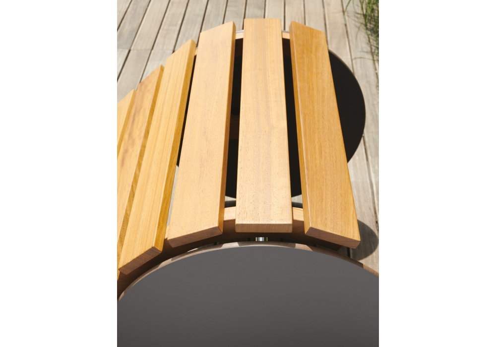 Suno firmato da Johan Lindstén per Potocco è un lettino da esterno regolabile con struttura e doghe in legno massello di Iroko e ruote in HPL antracite con protezione in gomma. Cuscino opzionale imbottito in DryFeel con rivestimento in differenti tessuti.