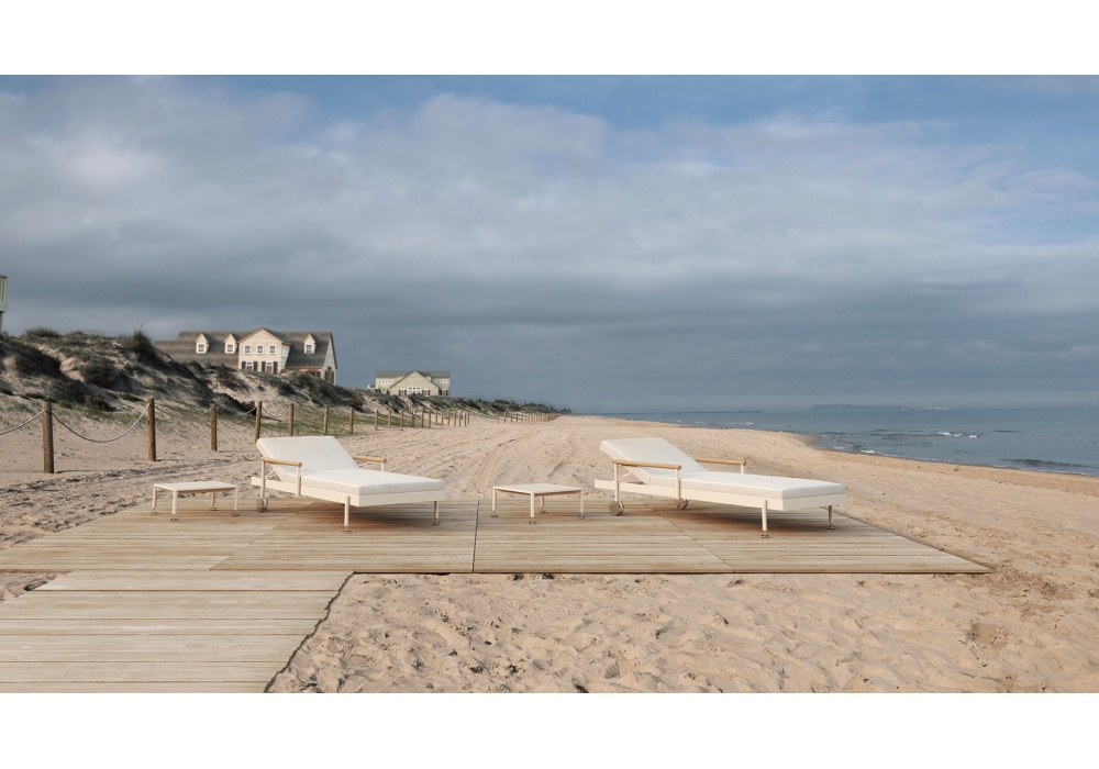 Hamptons firmato da Ramón Esteve per Vondom è un lettino realizzato con struttura in alluminio, dettagli in legno teak e cuscini imbottiti con rivestimento in tessuto.
