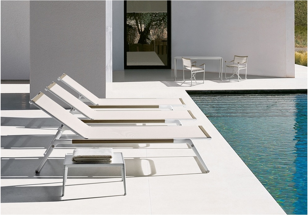Mirto firmato da Antonio Citterio per B&B Italia Outdoor è una Chaise Longue con bordi, profili bracciolo e ruote color tortora. Struttura in alluminio verniciato bianco o verniciato tortora, rete e parasole in tessuto Stige bianco naturale o tortora. Lo schienale è regolabile in quattro o cinque posizioni. Contrappeso cuscino poggiatesta in acciaio inox.