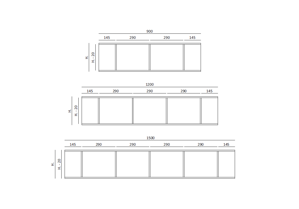 | Dimensioni | 90 x 22 x H 25 cm; 120 x 22 x H 25 cm; 150 x 22 x H 25 cm. |