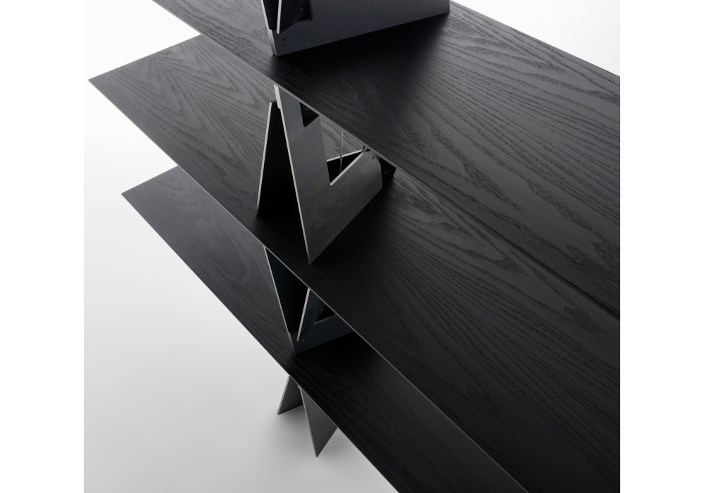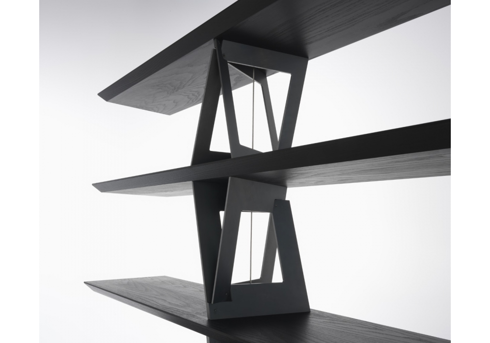 QuaDror™ 04 firmata da Dror per Casamania & Horm è una libreria con ripiani in tamburato di abete impiallacciato in frassino tinto moca e rinforzato con barre in alluminio. Montanti in metallo crudo. Due tiranti in acciaio uniscono dall'alto al basso gli elementi della struttura.