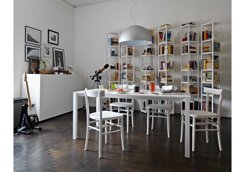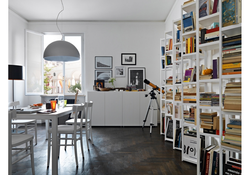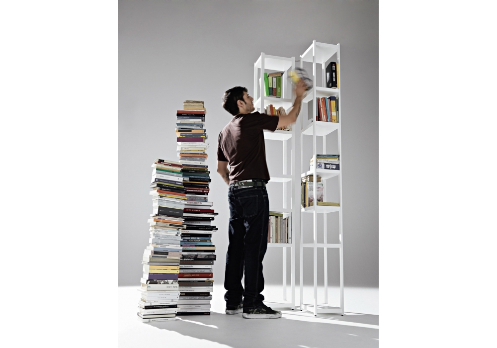 Singles firmata da Carlo Cumini per Casamania & Horm è una libreria composta da due colonne con spalle in noce canaletto oppure in faggio laccato bianco e ripiani fissi in MDF laccato bianco. La staffa di unione delle due colonne è in alluminio con angolo regolabile a 60, 90 o 120 gradi.