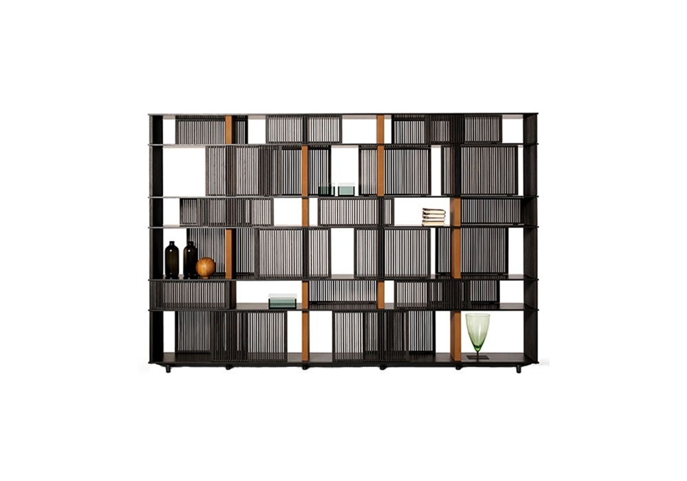 Lloyd firmata da Jean-Marie Massaud per Poltrona Frau è una libreria a geometria variabile. Sottili bacchette di legno verticali formano griglie leggere, che scorrono per tutta la lunghezza su invisibili binari orizzontali. Ogni griglia è spostabile a piacere per creare sequenze sempre diverse. Una partitura cangiante di pieni e vuoti, di luci e ombre.