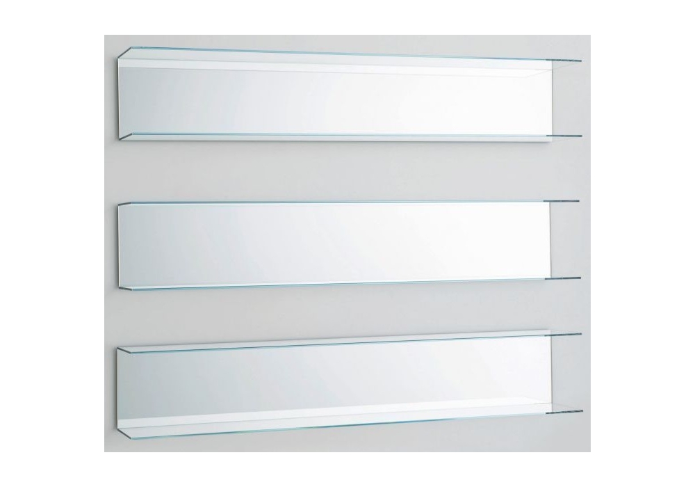 Everywhere firmata Studio GL per Glas Italia è una serie di mensole con schienale in specchio e doppio ripiano in cristallo trasparente extralight mm. 8 temperato. Questa mensola, dalla leggerezza e purezza formale, oltre a sorreggere e contenere si caratterizza per la sua funzione specchiante.