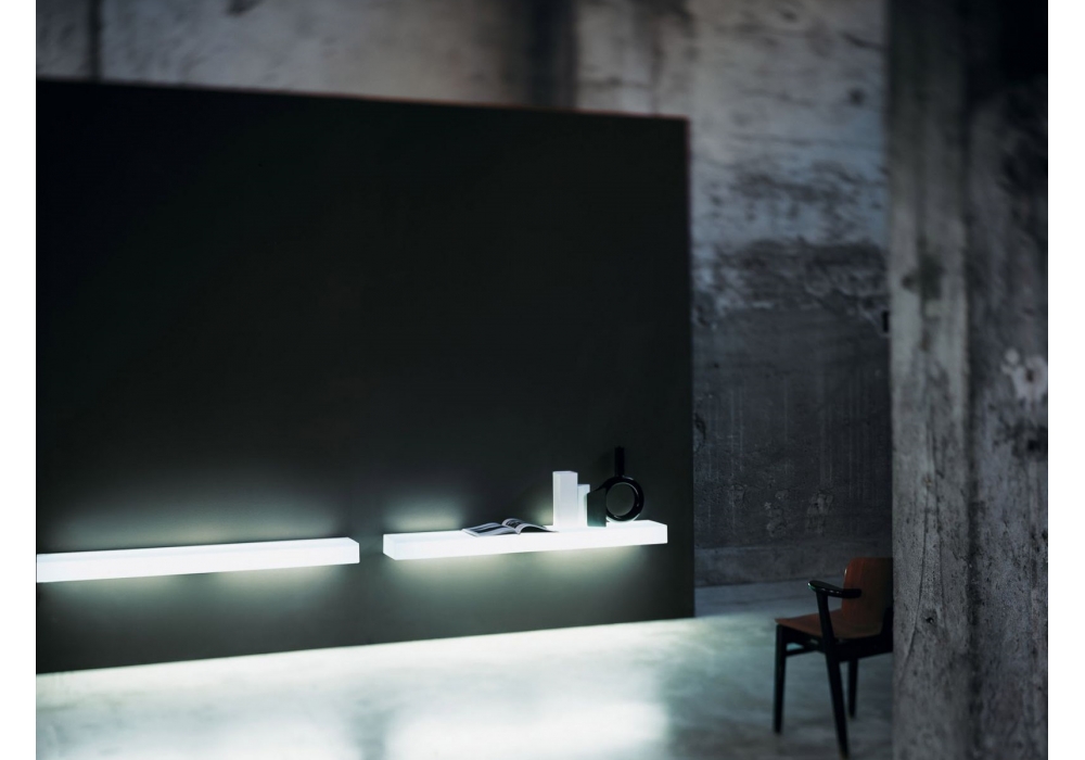 Light-Light firmata da Nanda Vigo per Glas Italia è una collezione di mensole realizzate incollando lastre di cristallo temperato mm.6, molato a 45°, opaco di colore bianco, con all’interno un impianto di luce a led con o senza dimmer. Per l’accensione e regolazione dell’intensità va prevista una pulsantiera a parete.