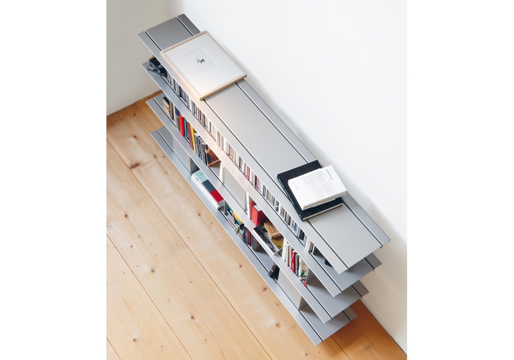 Zoll D firmata da Lukas Buol & Marco Zünd per Moormann è un libreria modulare dal design minimalista e funzionale realizzata in alluminio anodizzato argentato. Disponibile in diversi modelli.