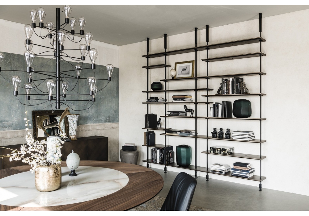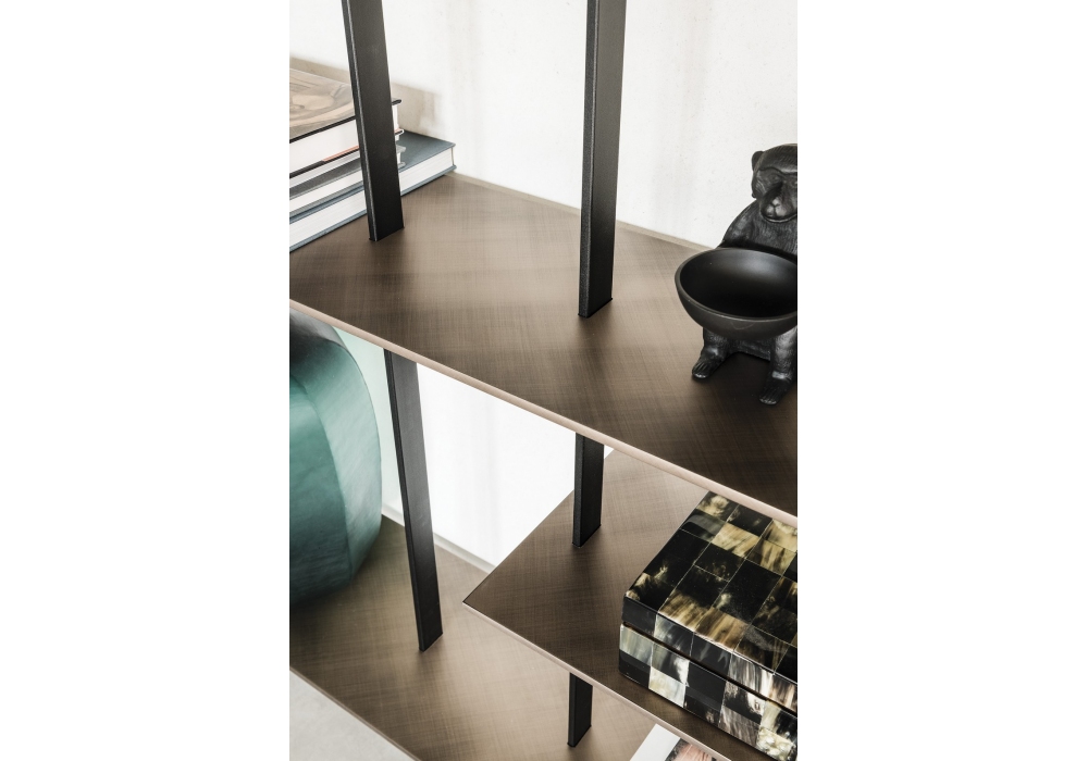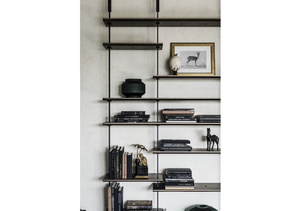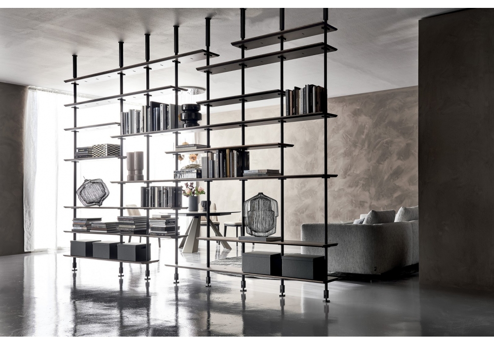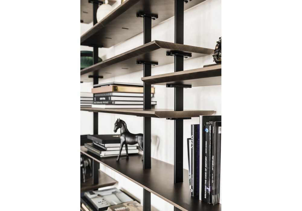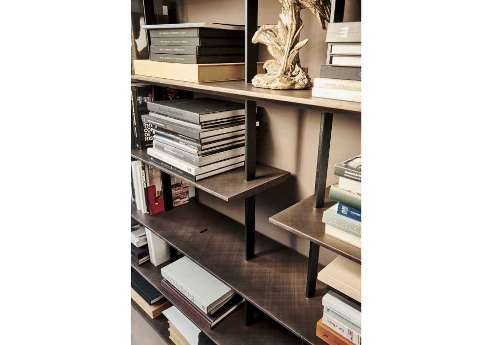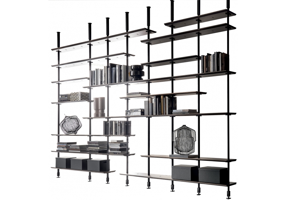 Airport firmata da Giorgio Cattelan per Cattelan Italia è una libreria componibile con montanti e staffe in acciaio verniciato goffrato nelle finiture bianco, titanio, nero o graphite opaco. Ripiani e contenitore in legno verniciato goffrato bianco, graphite, bronzo spazzolato, in noce Canaletto o rovere bruciato. Si può fissare a muro o a soffitto. Disponibile in diversi modelli.