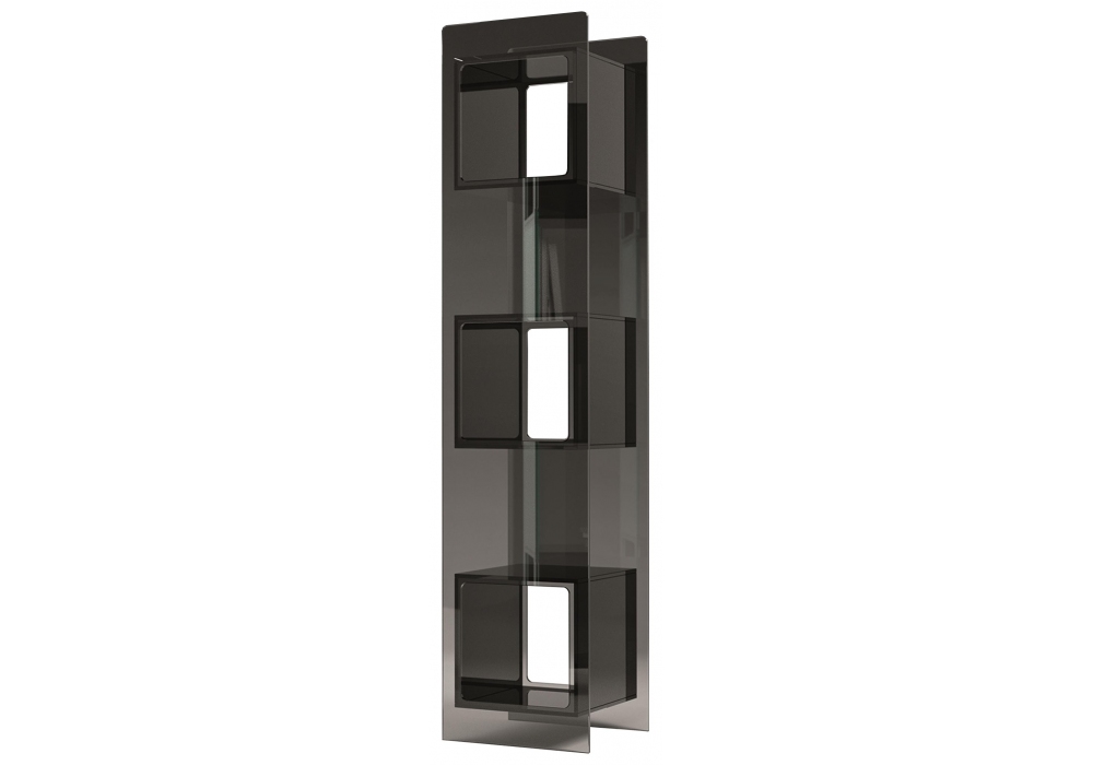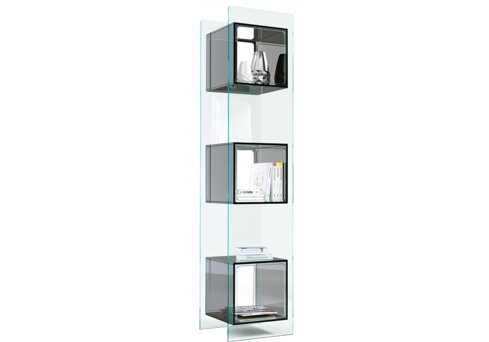 Magique Totem firmato da Studio Klass per Fiam è un espositore con cubi contenitori in vetro saldato realizzato in diverse finiture. Struttura in vetro extralight o fumè.