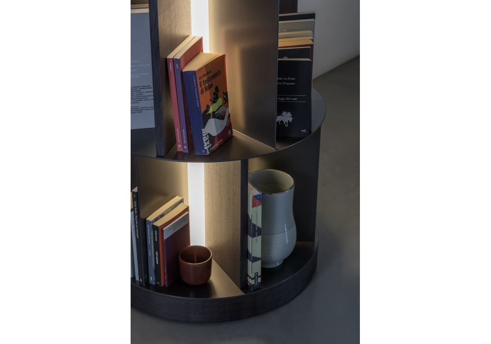 Babele firmata da Matteo Nunziati per Natevo è una libreria girevole con quattro ripiani orizzontali e divisori verticali di profondità diverse. La struttura in metallo e legno incorpora al centro una colonna dotata di LED che, oltre a illuminare, funge da asse di rotazione.