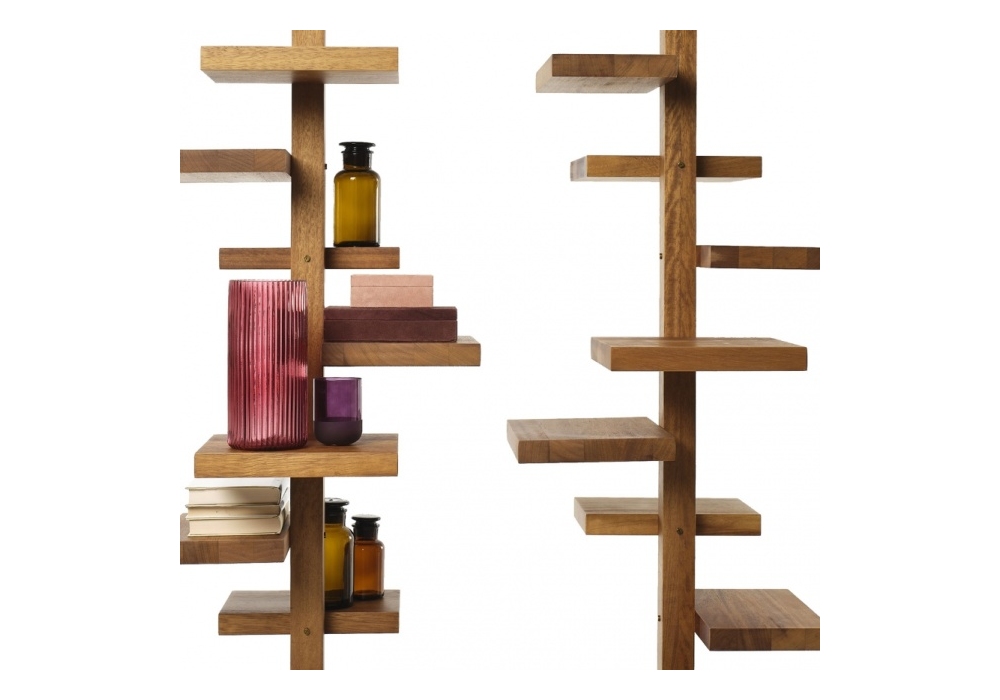 Adelaide Wood firmato da Claudio Bitetti per Mogg è un sistema di mensole realizzato in legno massello Iroko con 13 ripiani, predisposto per il fissaggio al soffitto. Adelaide è un'elegante libreria, terra-cielo con un piantone girevole a base quadrata al quale sono fissati in maniera asimmetrica sui 4 lati i ripiani di due misure differenti. Adelaide può essere utilizzata come divisorio, come libreria o portaoggetti personalizzando gli ambienti e sfruttando anche gli angoli.