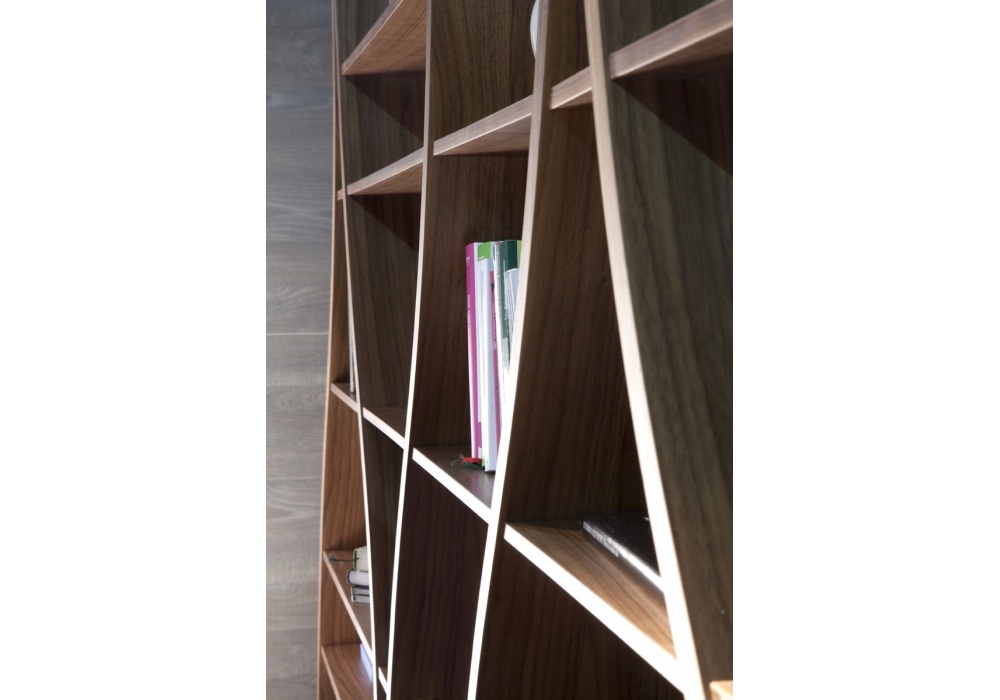 Silhouette 642 firmato da Stefan Heiliger per Tonon è uno scaffale con struttura in mdf impiallacciato noce canaletto (30 mm) e ripiani in betulla impiallacciati noce canaletto (18 mm). Disponibile in due versioni con struttura asimmetrica che si ispira al movimento degli alberi.