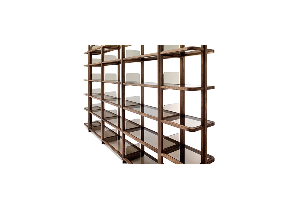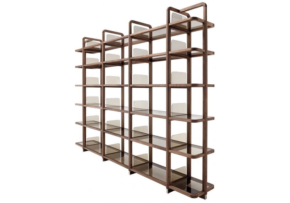 Young Holden firmata da Roberto Lazzeroni per Ceccotti Collezioni è una libreria modulare autoportante realizzata in massello di noce americano. Mensole e reggilibri in vetro trasparente, bronzato o fumè. Piedini regolabili in acciaio inox satinato.