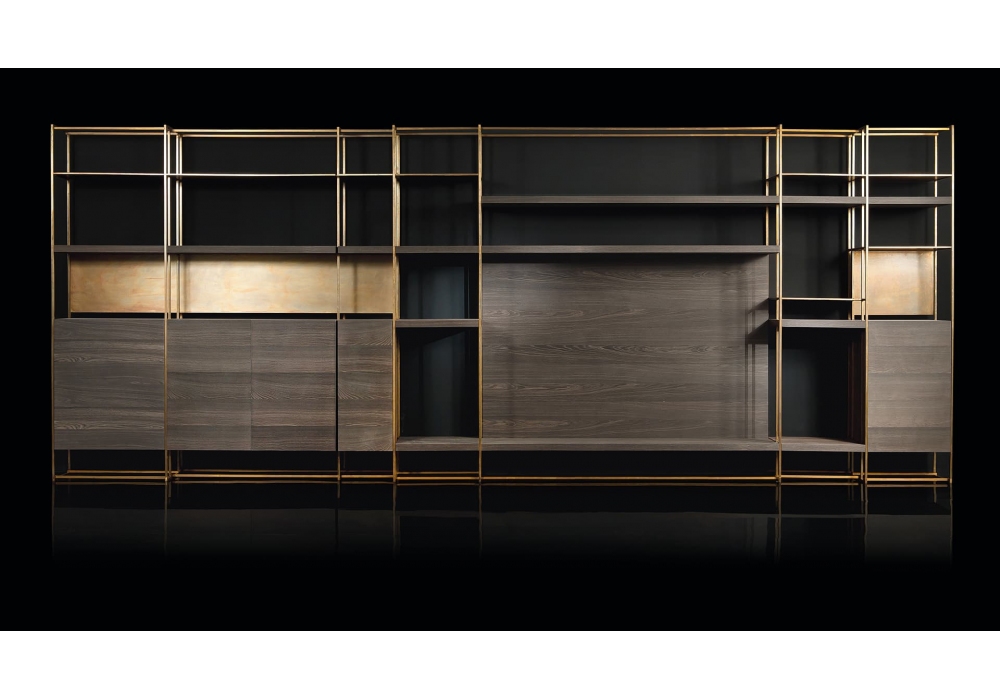 Cage-C firmata da Massimo Castagna per Henge è una libreria composta da struttura in tubo quadrato di ottone brunito a mano e ripiani in legno termotrattato o legno di palude.