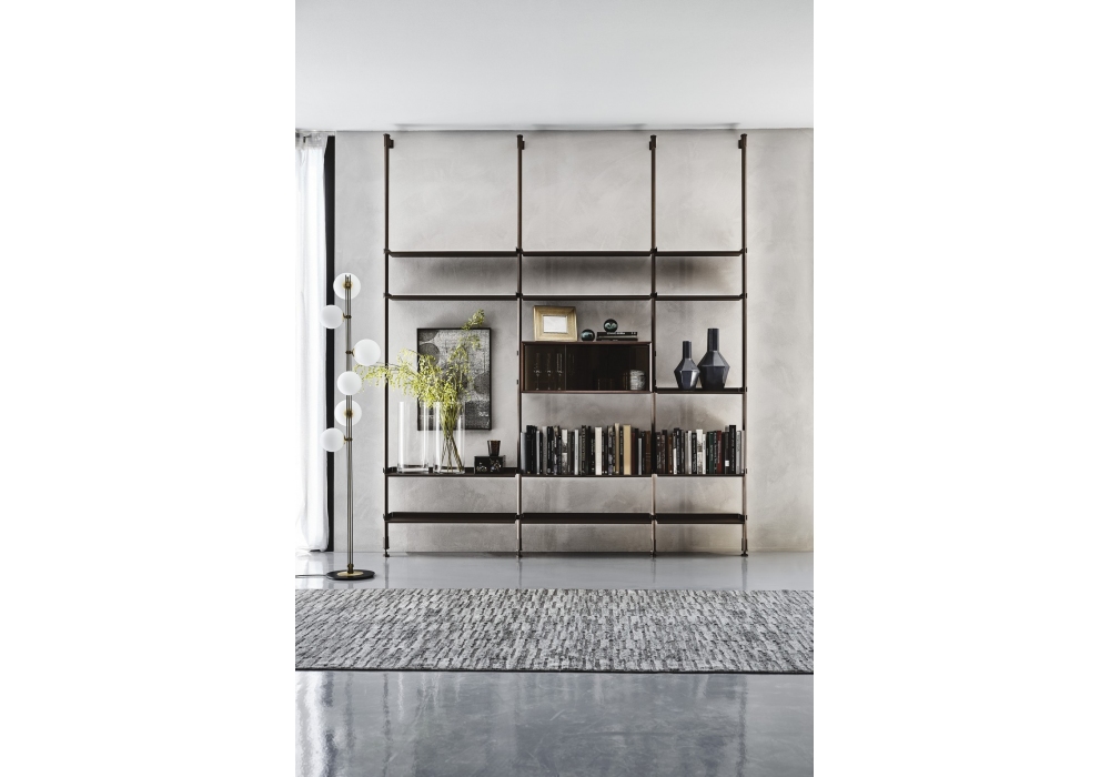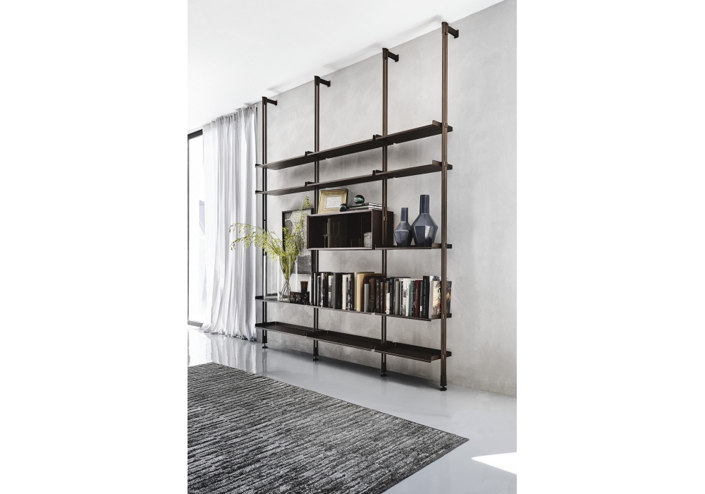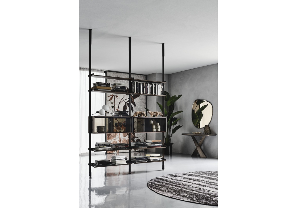 Freeway firmata da Giorgio Cattelan per Cattelan Italia è una libreria modulare disponibile con fissaggio a muro o a soffitto. Montanti, reggipiani e ripiani in acciaio verniciato goffrato titanio o bronzo. Contenitori in legno verniciato goffrato titanio o bronzo e vetro fumé.