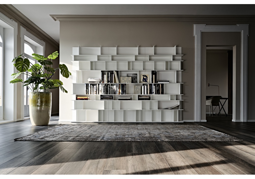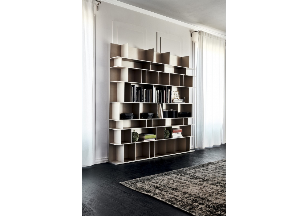 Wally firmata da Philip Jackson per Cattelan Italia è una libreria modulare con struttura in MDF laccato color titanio, bronzo o bianco goffrato fine.