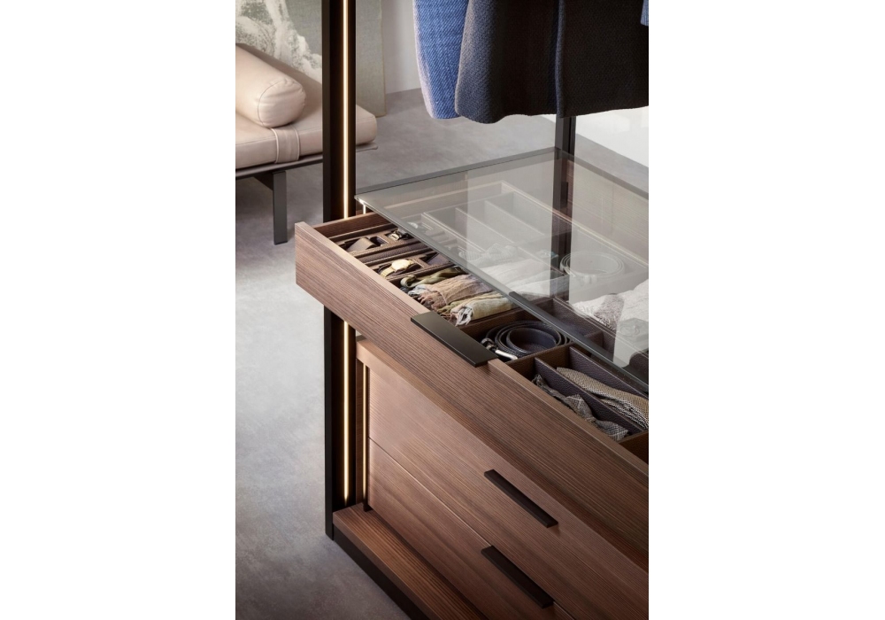 Armadio al Centimetro firmato da Lema è un sistema modulare dal carattere distintamente contemporaneo, innovativo dal punto di vista tecnologico, frutto dello sviluppo di un insieme di telai in alluminio, disponibili in due finiture: bronzo e sand. Lo schienale esterno è chiuso da un fondale in vetro, sostituibile al tradizionale fondale in melaminico ed è proposto in tre finiture di trasparenza, come per il fianco terminale: vetro trasparente extralight, vetro bronzo riflettente e vetro fumè grigio.