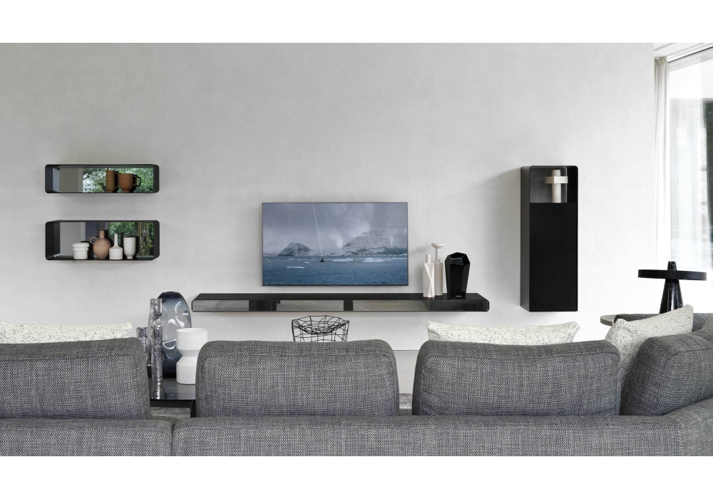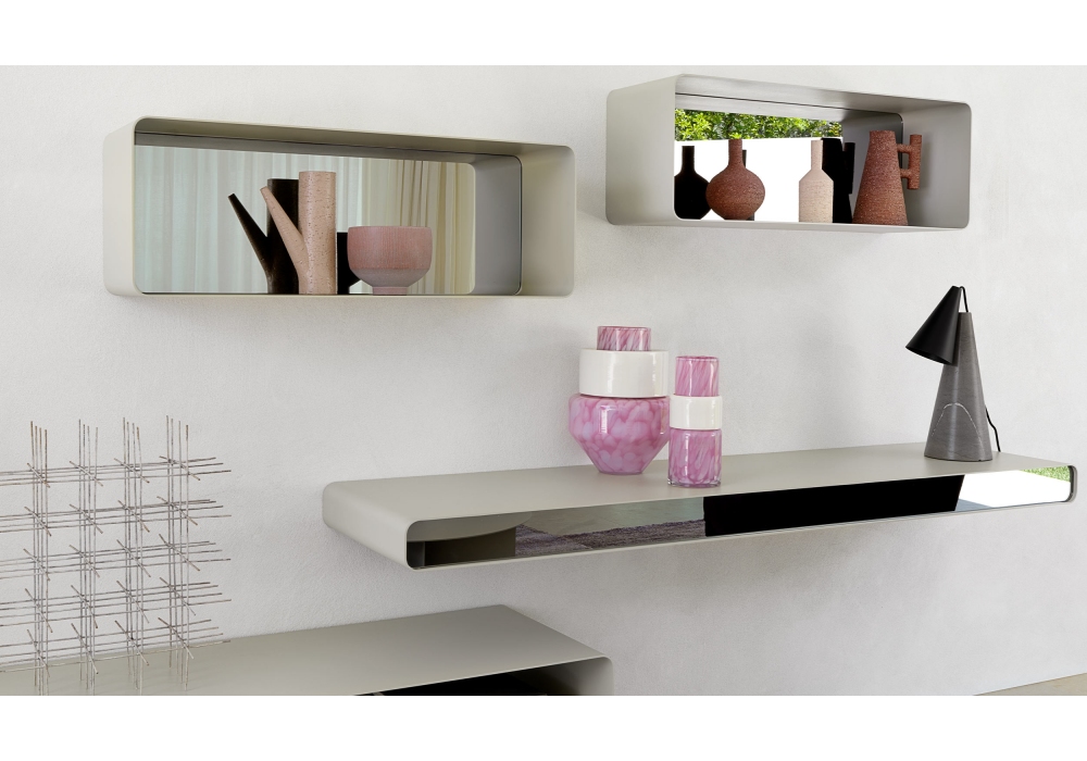 Foglio firmata da Pinuccio Borgonovo per Flou è una mensola realizzata in metallo curvato in diverse finiture. Frontale nella stessa finitura della struttura o a specchio nella finitura fumé o bronzo.