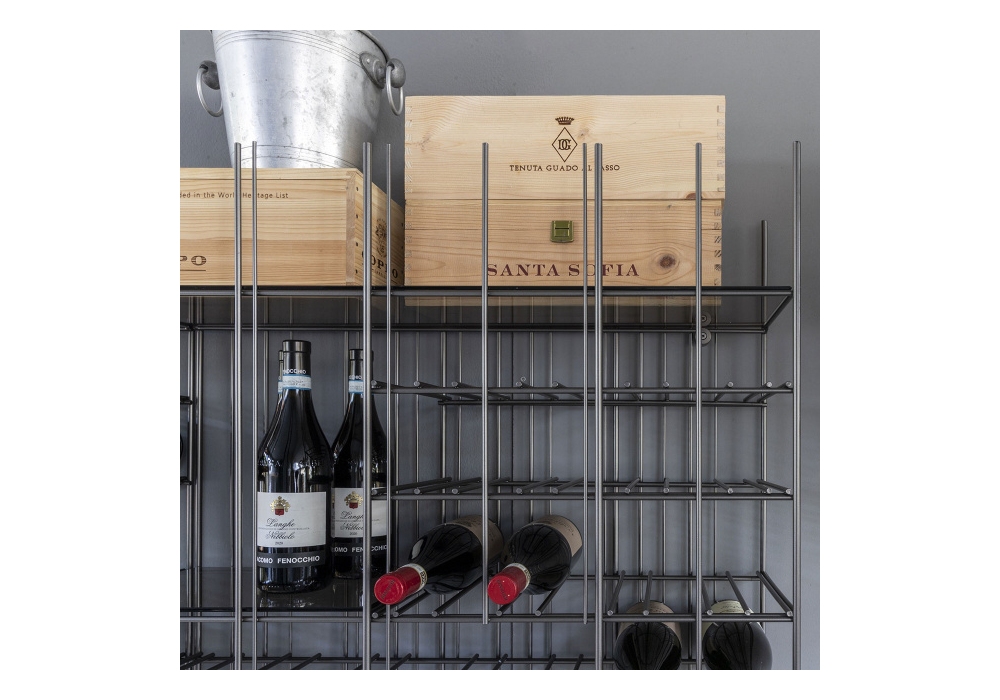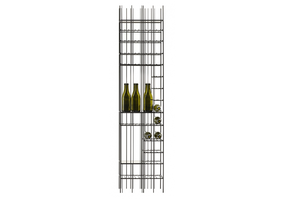 Metrica Wine firmato da CTRLZAK per Mogg è un portabottiglie da terra in metallo finitura brunito. Piedini regolabili, 2 ganci di fissaggio di sicurezza a parete e 2 giunti di unione inclusi. Completo di 3 ripiani in vetro di colore bronzo o verde e griglie portabottiglie. Richiede il fissaggio a parete. Disponibile in 2 dimensioni.