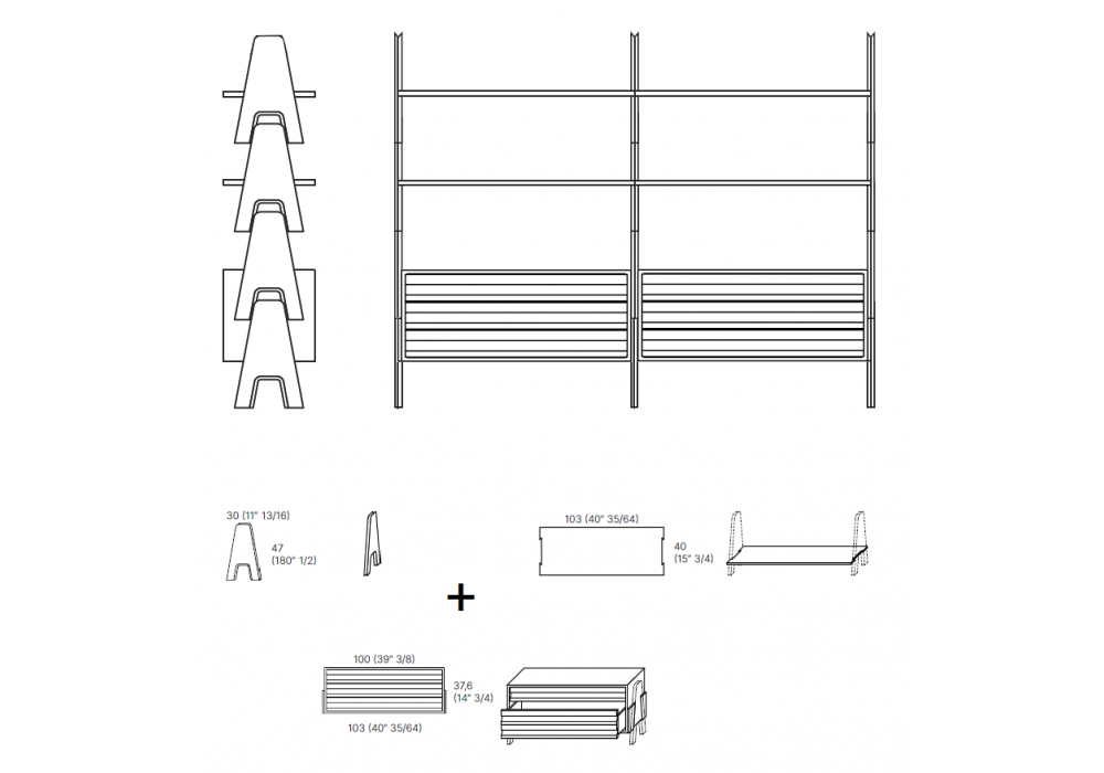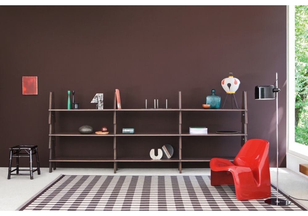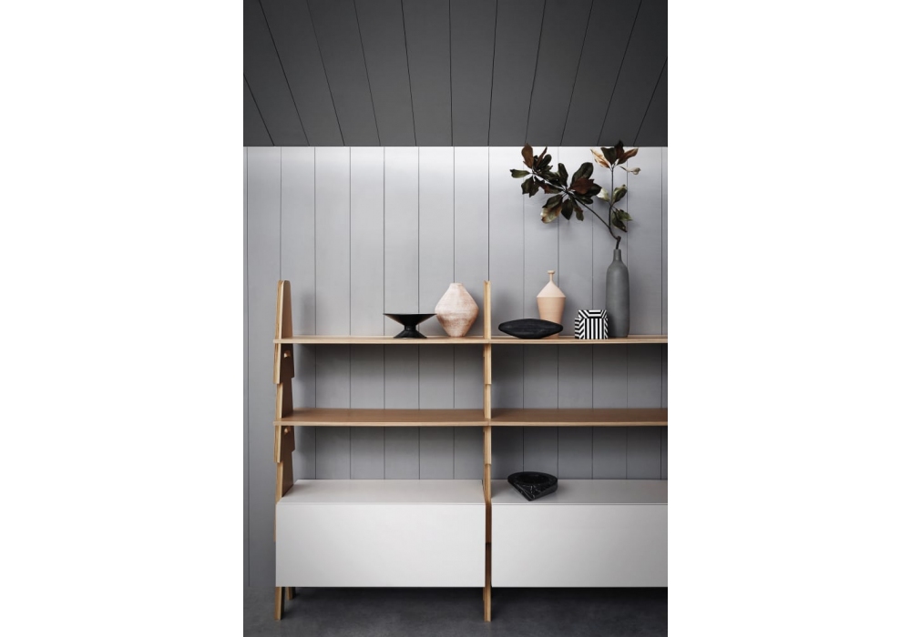 Cavalletto firmata da Angelo Mangiarotti per Agapecasa è una libreria modulare realizzata da elementi verticali impilabili in multistrati di betulla in diverse finiture.