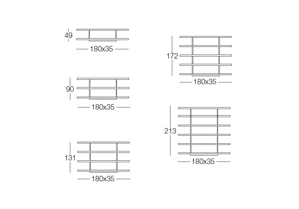 | Dimensioni | 180 x 35 x H 49 cm; 180 x 35 x H 90 cm; 180 x 35 x H 131 cm; 180 x 35 x H 172 cm; 180 x 35 x H 213 cm; |