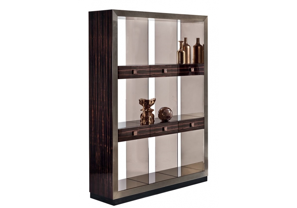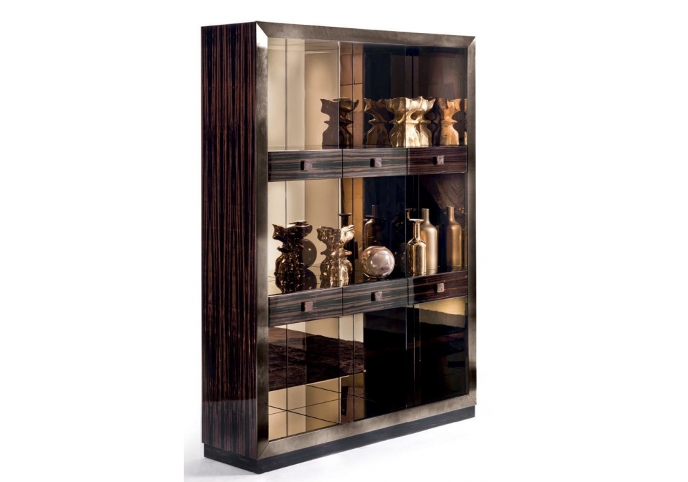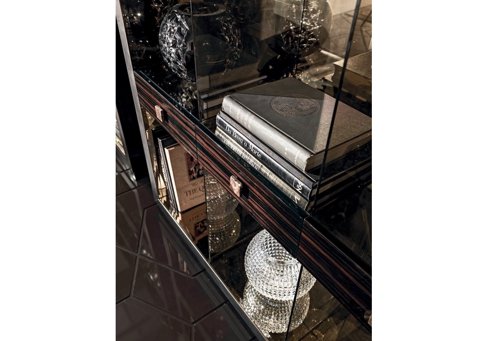 Emily firmata da Guseppe Viganò per Longhi è una libreria con sei cassetti, la struttura è in legno in essenza o laccata lucida e il bordo frontale è in metallo rettificato. Maniglie in marmo. Interni rivestiti con specchio bisellato bronzo o fumè. Disponibile nella versione con o senza schienale.