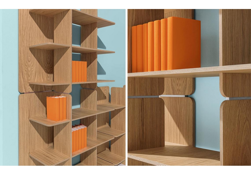 Axis firmata da Studio Klass per Discipline è una libreria modulare in legno impiallacciato rovere naturale con giunti in alluminio spazzolato. Disponibile con schiena in rovere naturale