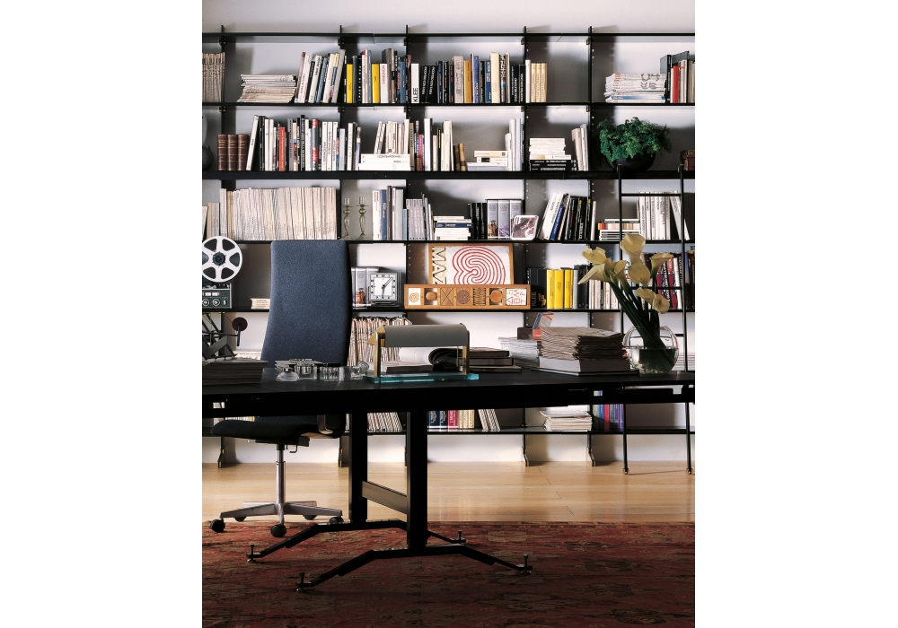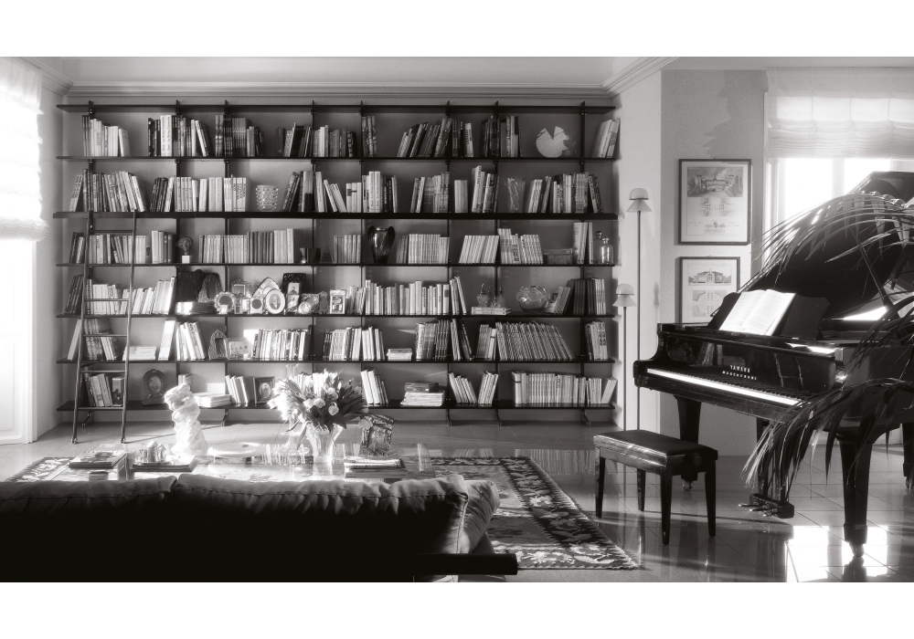 Elegie firmata da Ignazio Gardella per MisuraEmme è una libreria realizzata con montante, preforato e completo di piastre e bulloni per l’ancoraggio a parete, in metallo verniciato epossidico colore nero poggiante su una scarpetta in acciaio. Ripiani in due profondità realizzati in laccato opaco o essenza. Ripiani con profondità 460mm sono utilizzabili quali scrittoi, piani TV o attrezzature audiovisive. La componibilità in larghezza si realizza semplicemente grazie all’accostamento dei singoli moduli.