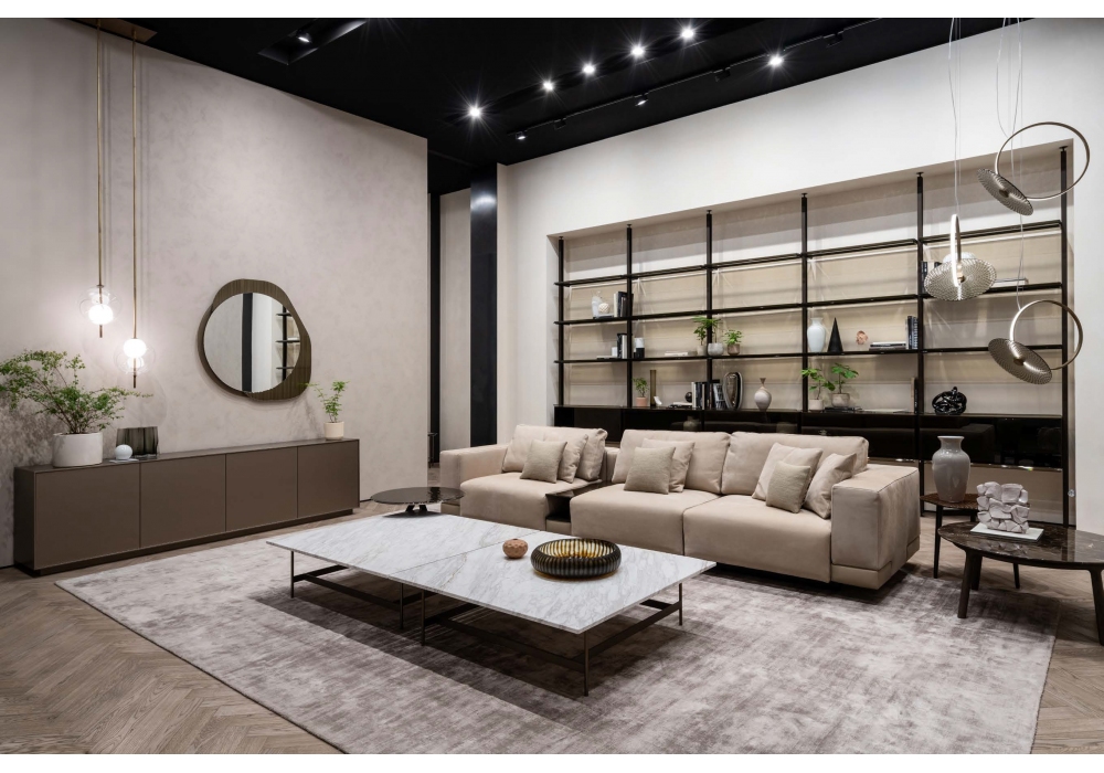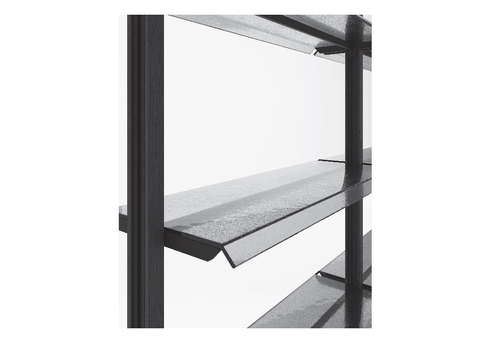 Remind firmata da Simone Bonanni per Fiam è una libreria a parete in alluminio, vetro e legno, disponibile in versione con fissaggio a soffitto oppure con fissaggio a parete. Struttura composta da montanti verticali e traversi in alluminio anodizzato nero. I montanti verticali presentano una modanatura in legno massello. Ripiani in vetro extralight, fumè o bronzo fuso a gran fuoco. Elementi contenitori con struttura in nobilitato finitura legno ed ante a ribalta in vetro curvato extralight, fumè o bronzo.
