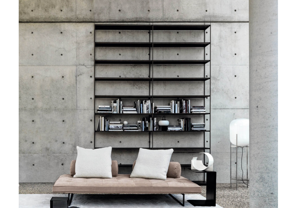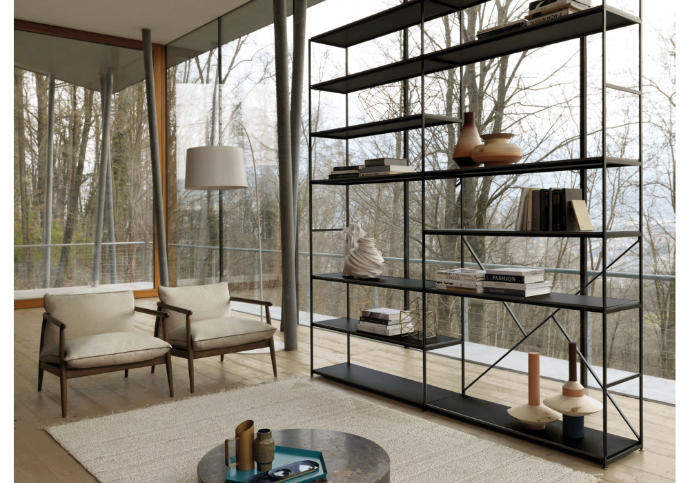 Image firmata da Roberto Gobbo per Désirée è una libreria modulare con struttura in metallo con verniciatura goffrata a polveri epossidiche. I ripiani sono in metallo verniciato, MDF laccato o frassino impiallaciato.