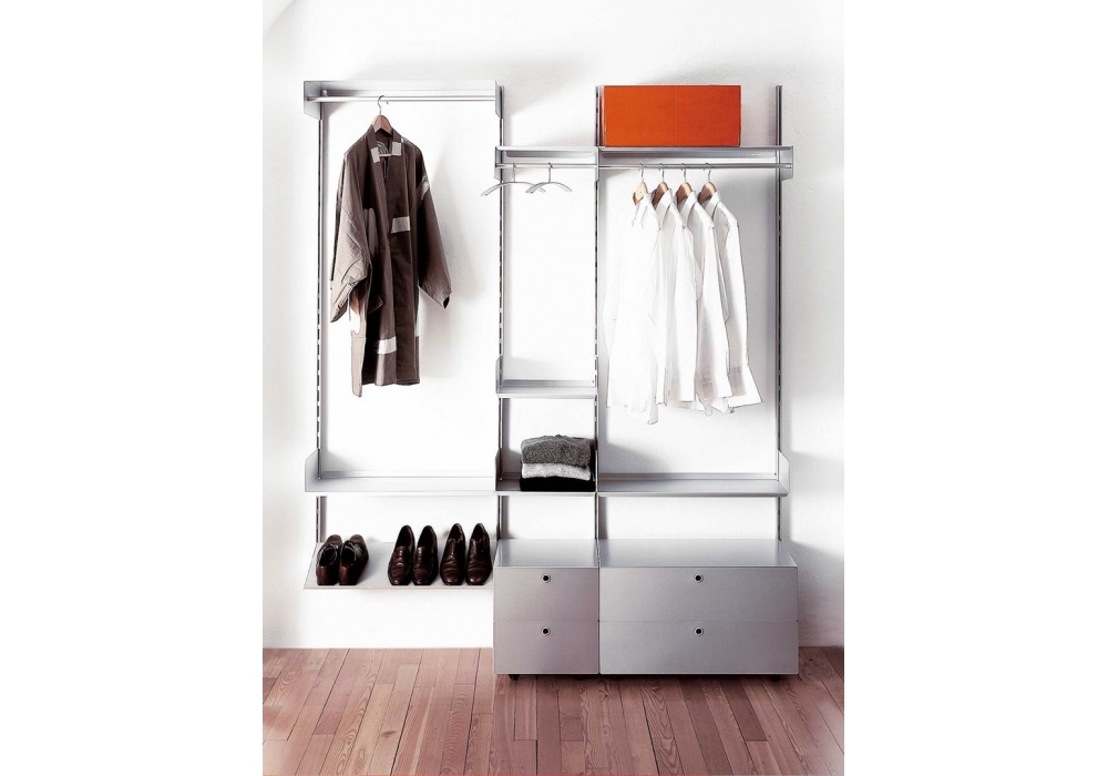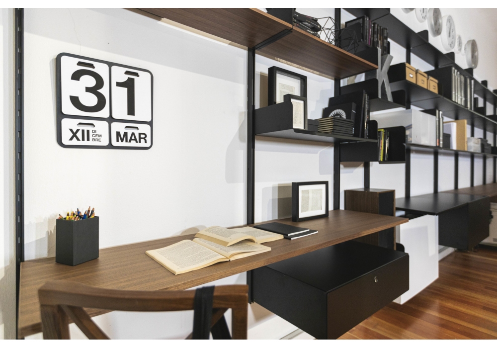 K1 firmato da Kriptonite è un sistema a parete interamente realizzato in alluminio. I montanti a cremagliera, cuore strutturale del sistema, consentono di scegliere liberamente la posizione degli elementi (ripiani, accessori e contenitori) così da adattare la libreria alle proprie esigenze di spazio e dimensioni. La varietà delle dimensioni disponibili, le 5 diverse finiture di colori RAL e le due essenze di legno, rovere e noce canaletto, fanno di K1 un sistema d'arredo capace di interpretare ogni ambiente, sia domestico che professionale.