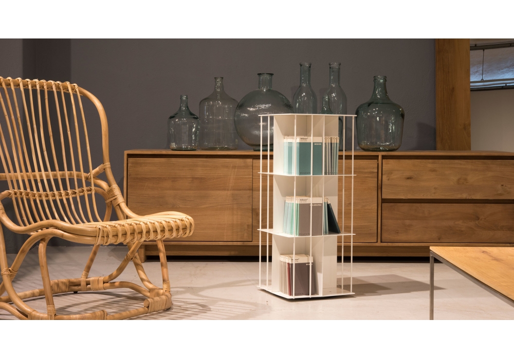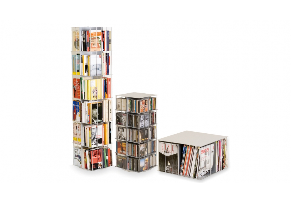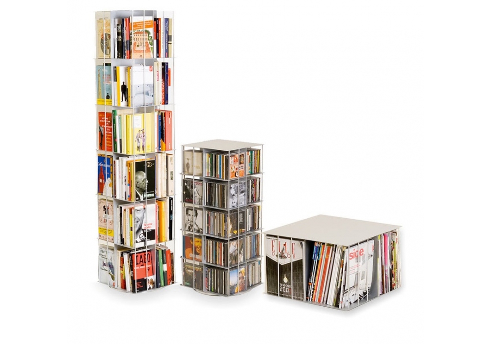 Krossing Rotante firmato da Kriptonite è un sistema autoportante e girevole, è realizzato secondo lo stesso principio della Krossing a parete, composto da elementi semplici come tubetti, piani e divisori. Vengono fornite due misure di piani: 33x33 cm (libri, CD, DVD) e 50x50 cm (riviste) non combinabili tra loro. È possibile comporre la propria struttura con i moduli base e aggiuntivi. Disponibile in alluminio anodizzato o bianco. Oltre alle dimensioni e finiture standard, è possibile richiedere misure e colori speciali.