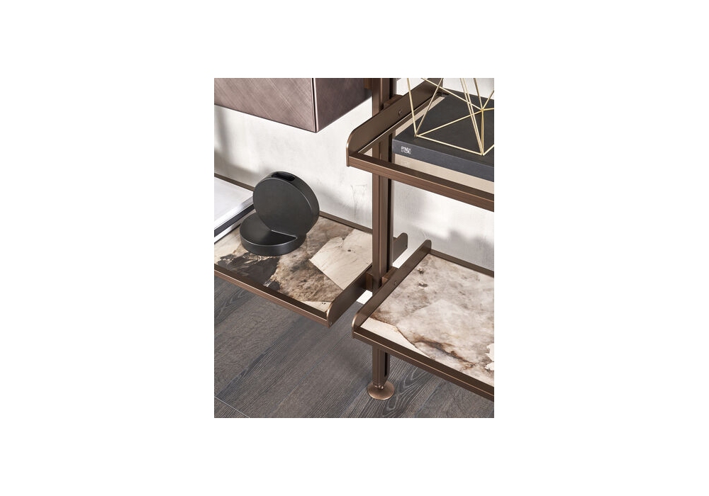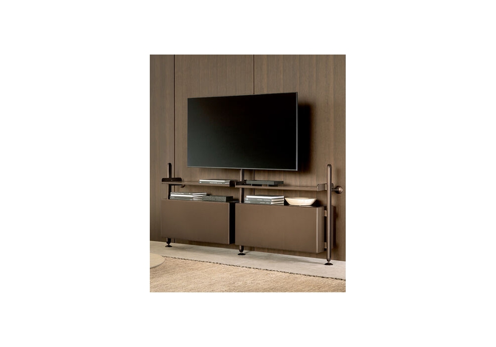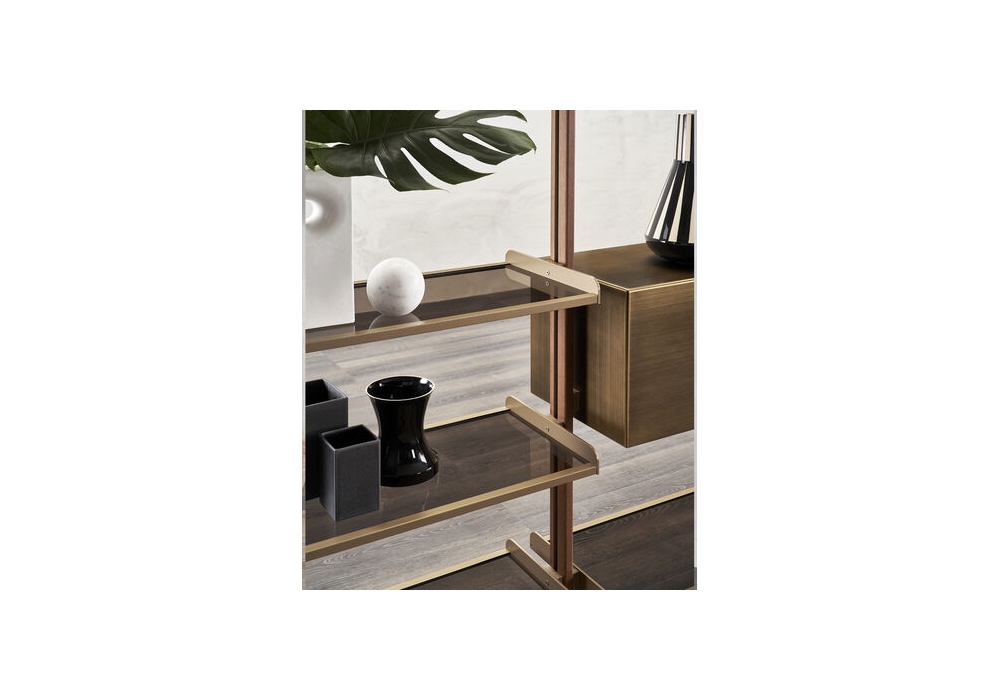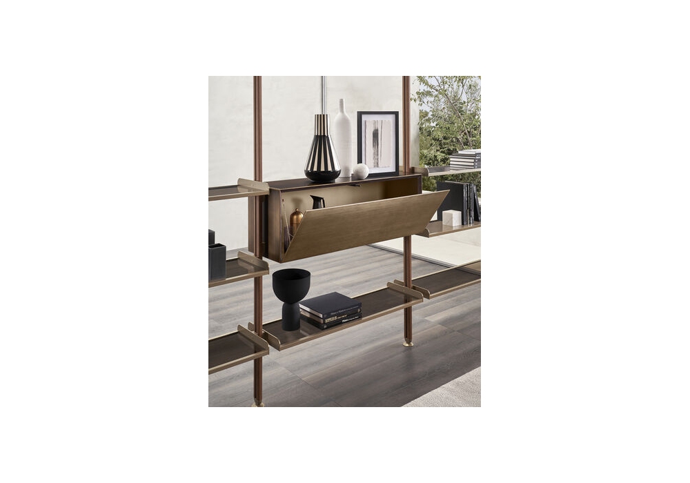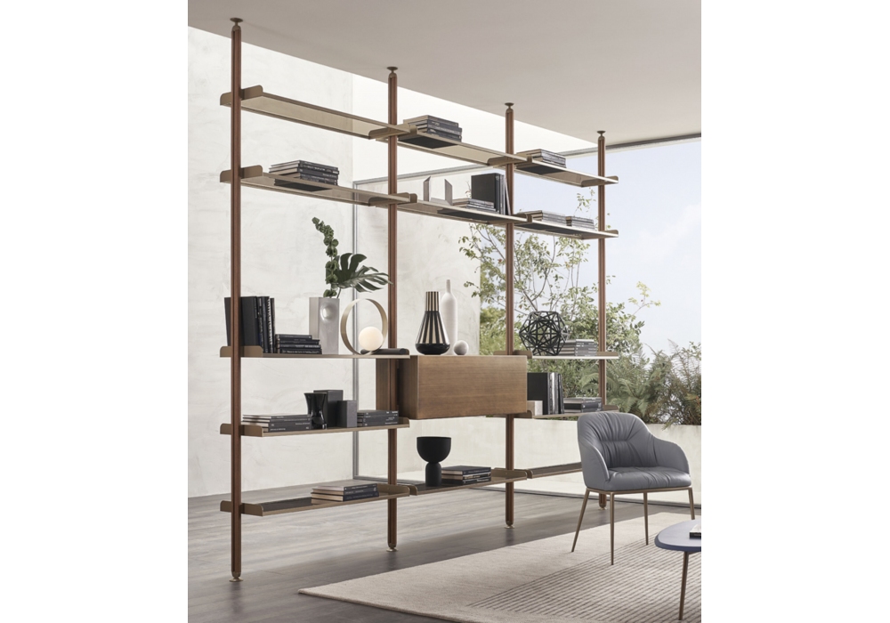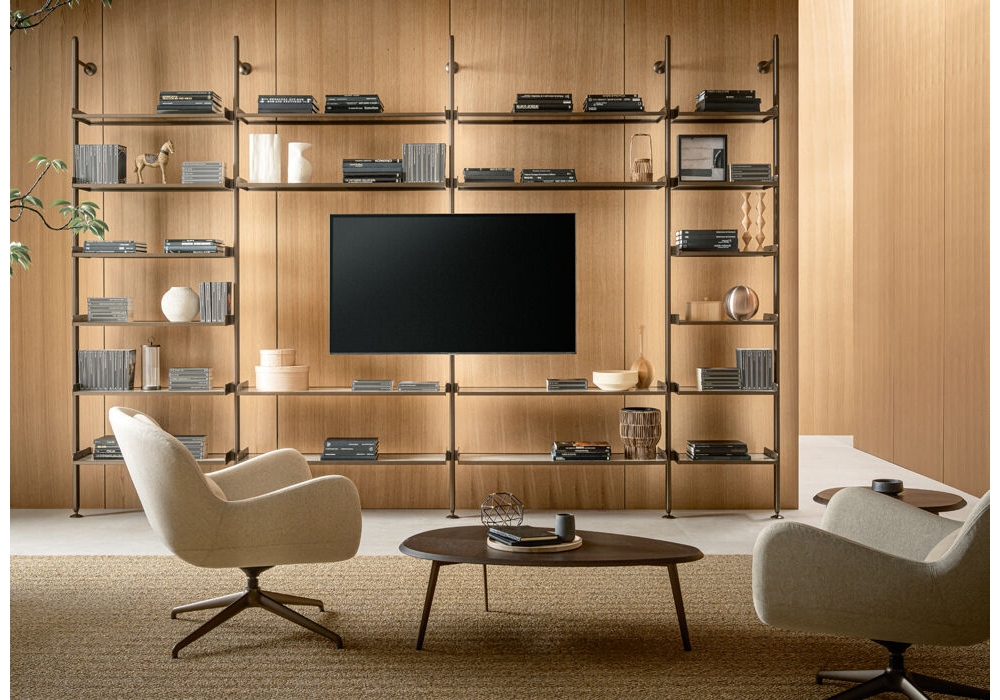 Techwall firmata da Riflessi è una libreria multifunzione dal design essenziale e sofisticato, pensata per arredare, dividere e valorizzare gli spazi senza chiuderli. Componibile, personalizzabile e riconfigurabile all’infinito, unisce una struttura in alluminio leggera e raffinata a ripiani in vetro o ceramica e contenitori in legno laccato. Installabile a parete o a soffitto, si adatta perfettamente a ogni ambiente, anche con soluzioni su misura. Tra gli optional, il braccio orientabile porta TV e l’illuminazione LED integrata.