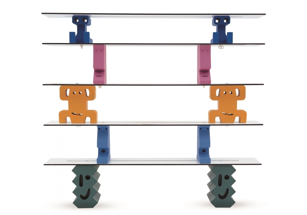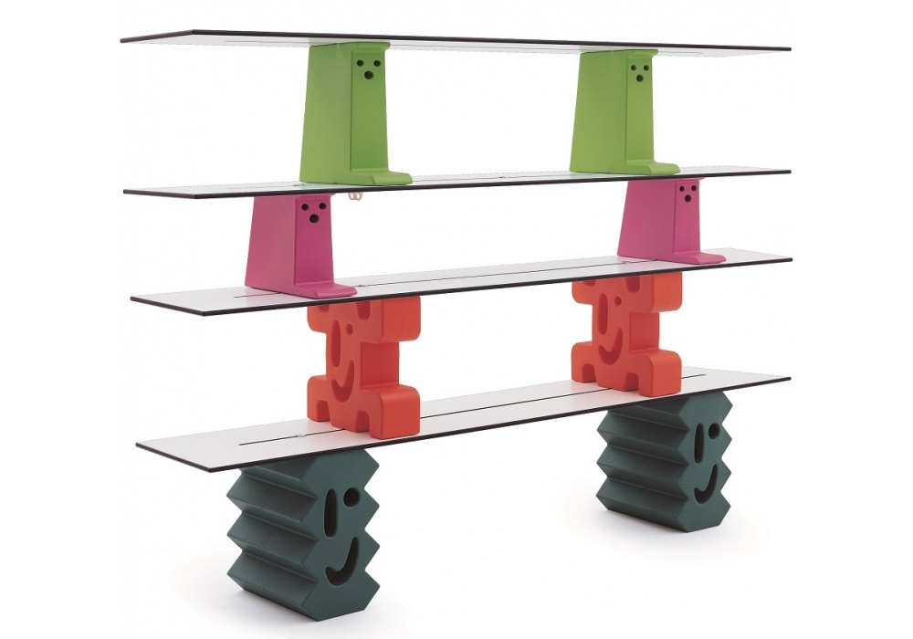 Ladrillos firmato da Javier Mariscal per Magis Me Too è una libreria componibile. Mattoni in polietilene completi di vite a farfalla e asta di fissaggio in tondino di acciaio zincato. Piani in HPL. Base disponibile in differenti moduli.